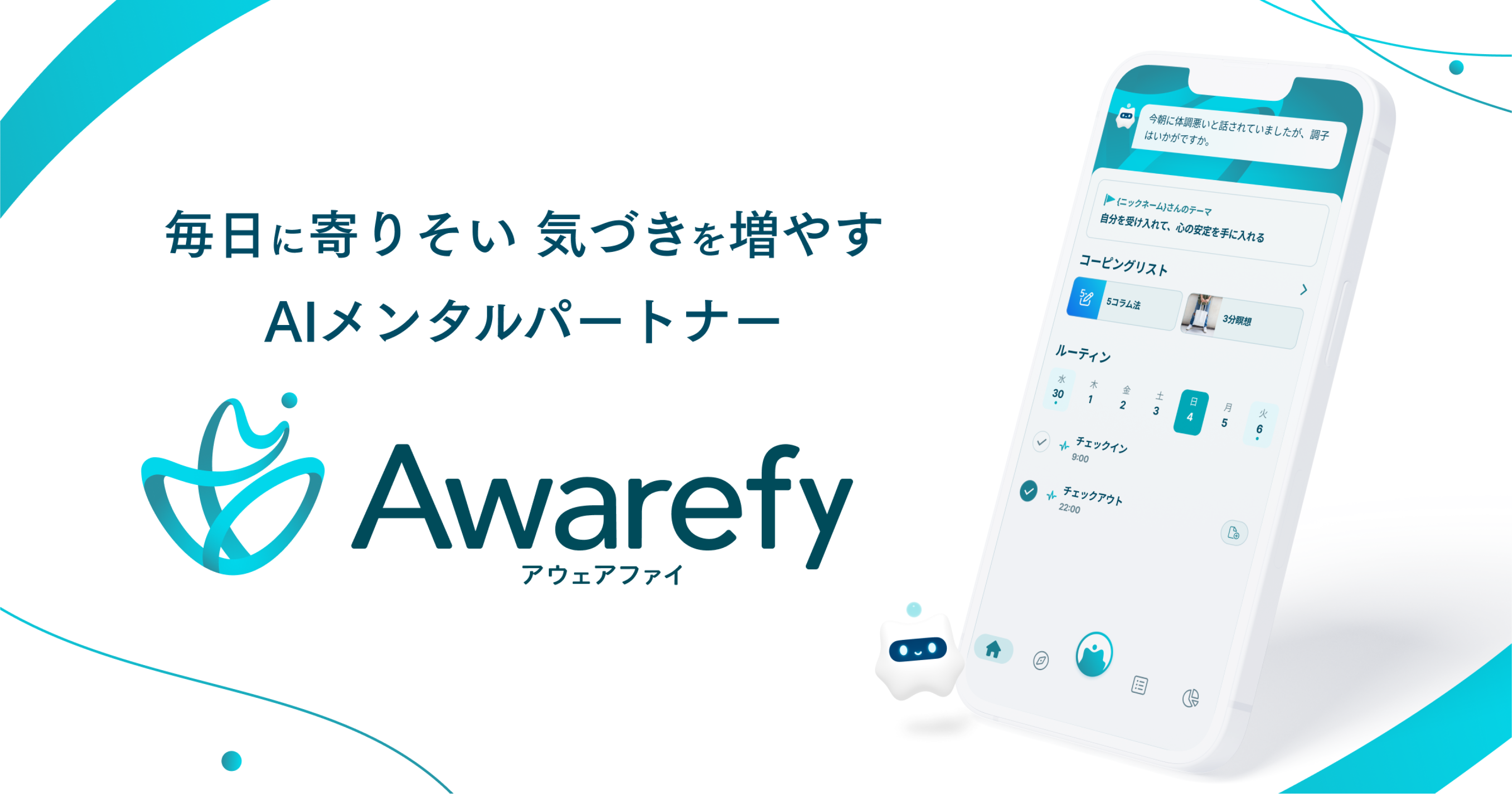 私たちは、最先端AIテクノロジーに、科学的なエビデンスのある「認知行動療法」等に基づくアプローチをかけあわせたAIメンタルパートナー「アウェアファイ」アプリの開発・運営を中心とした事業を展開しています。人々が自分の“大切にしたいこと“と向き合える社会を実現すべく、アプリの機能拡充にとどまらず、復職・職場復帰を目指す方をサポートする施設「アウェアファイ リワーク」の運営など、メンタルヘルスケアの領域での貢献を目指します。