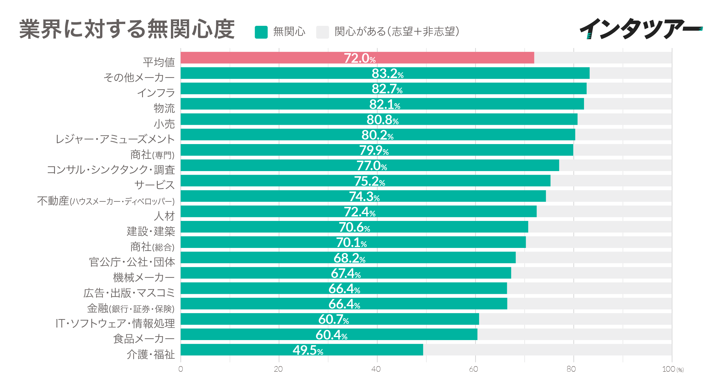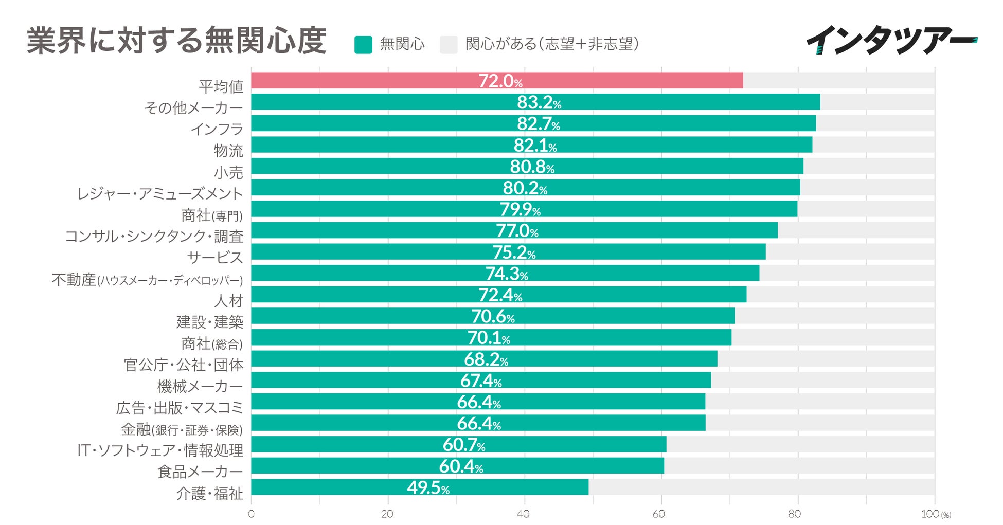 - 志望・非志望ともに少ない「無関心」業界は「その他メーカー」「インフラ」「物流」など