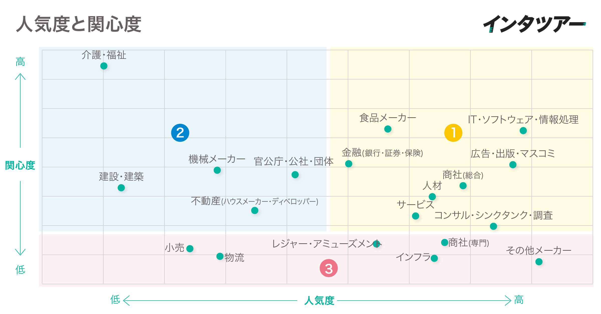 1.学生の志望度・関心度ともに比較的高い業界は「IT」「食品メーカー」など