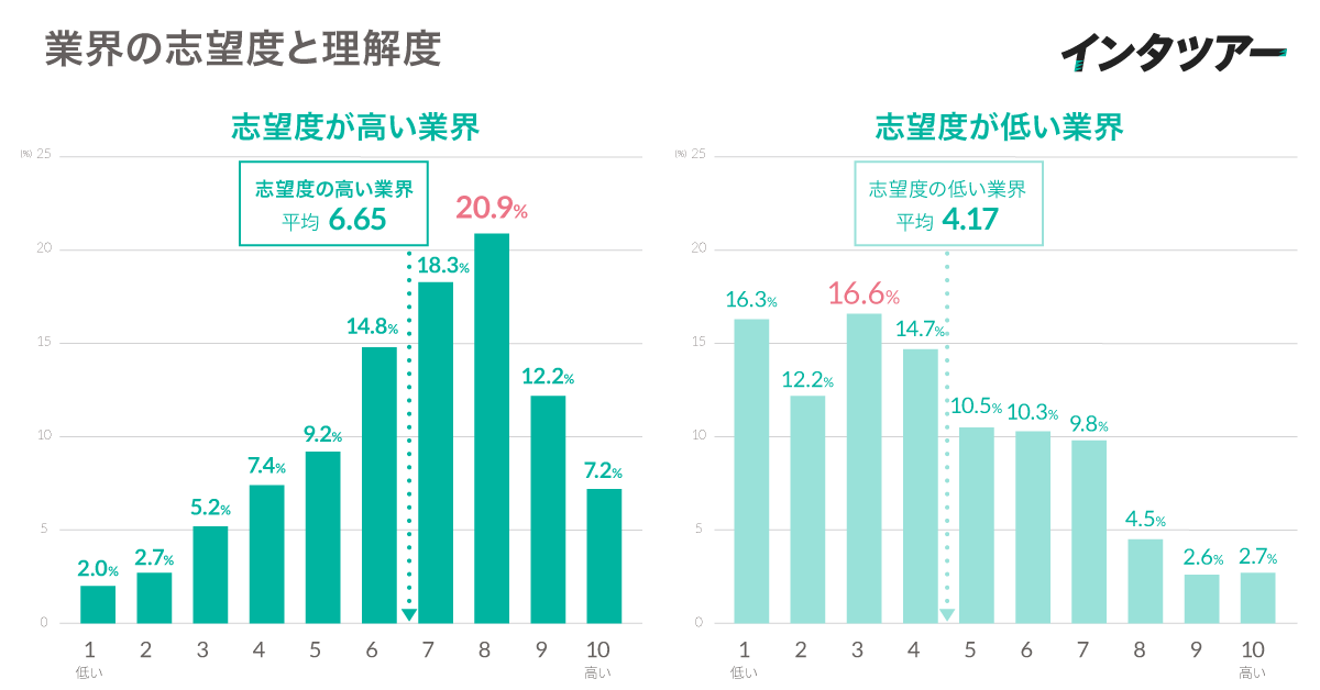 志望度の高い業界についての理解度は、10段階で「8」と回答した学生が最も多く20.9%で、平均値で「6.65」となりました。志望度の低い業界についての