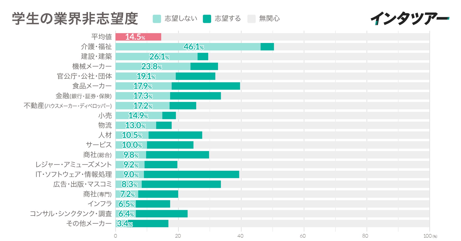 - 学生が志望しない業界は「介護」46.1%、「建設」26.1%が上位