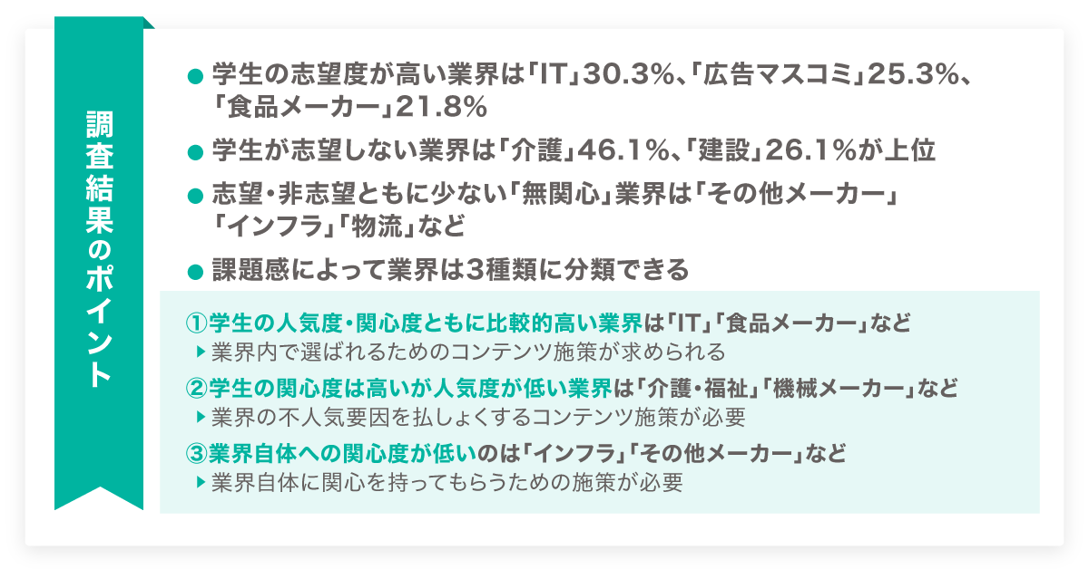 就職活動における業界研究の際、学生は「人気企業」「不人気企業」や「自分に向いている業界」などの情報を蓄積していく傾向があります。業界によって学生の志望度や関心度は大きく異なるため、学生の傾向を把握した採用計画をたてることが非常に重要になります。