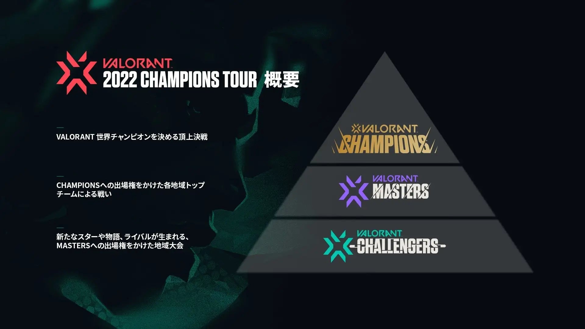 VALORANT Champions Tourには、「Challengers」、「Masters」、そして「Champions」の3段階で構成されます。地域大会である「Challengers」(年2回)はオープン予選と本戦からなり、勝ち上がったチームは各地域を代表するチームが集結する国際大会「Masters」(年2回)に出場します。そして、シーズンのフィナーレを飾る「Champions」は世界最高峰のトーナメント戦で、これを制覇したチームがVALORANT世界王者となります。