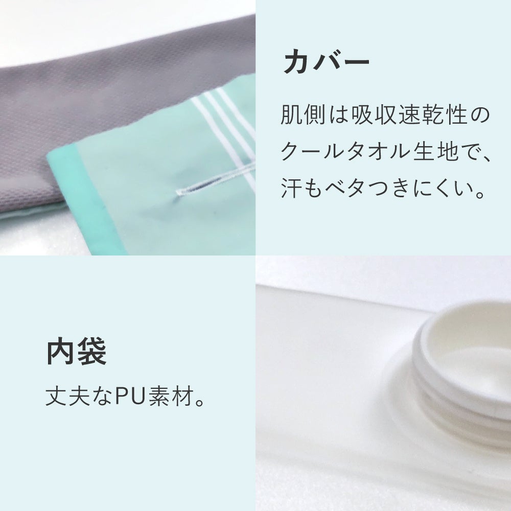 氷や冷水を入れて首などに巻いて使うことができる氷嚢。PU素材の内袋と、カバーの二重構造で汗のベタつきを防止。