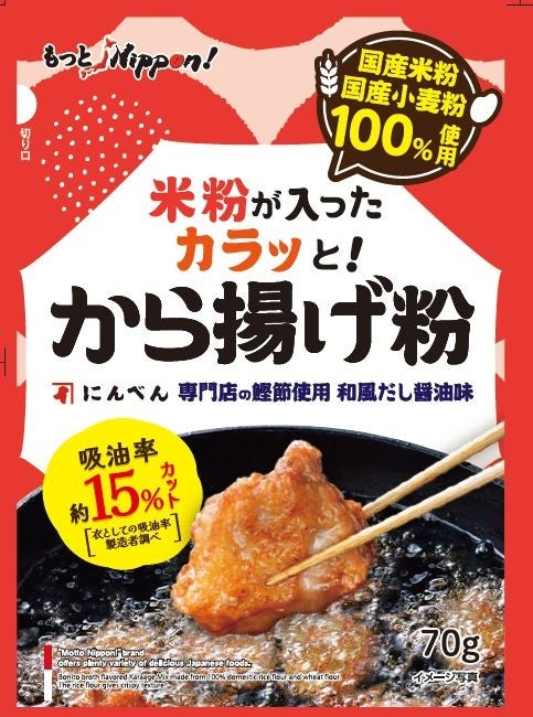 地域特産ブランド『もっとNippon!』から、国産米粉を使用した新商品「カラッと!から揚げ粉」と「サクッと!天ぷら粉」の2品を発売