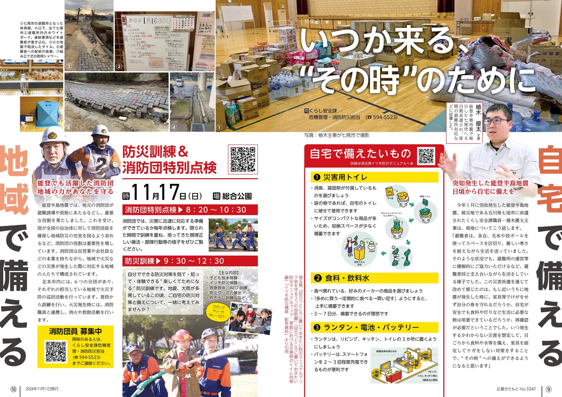 能登半島地震の被災自治体へ派遣された北本市職員が現地で撮影した、避難所や被災状況等の写真を掲載。北本市民の皆さんに実践していただきたい自宅での備えとして、「災害用トイレ」「食料・飲料水」「ランタン・電池・バッテリー」をご紹介。地域での備えとして、能登半島地震でも活躍した消防団と、11月17日(日)に予定している防災訓練について案内しています。