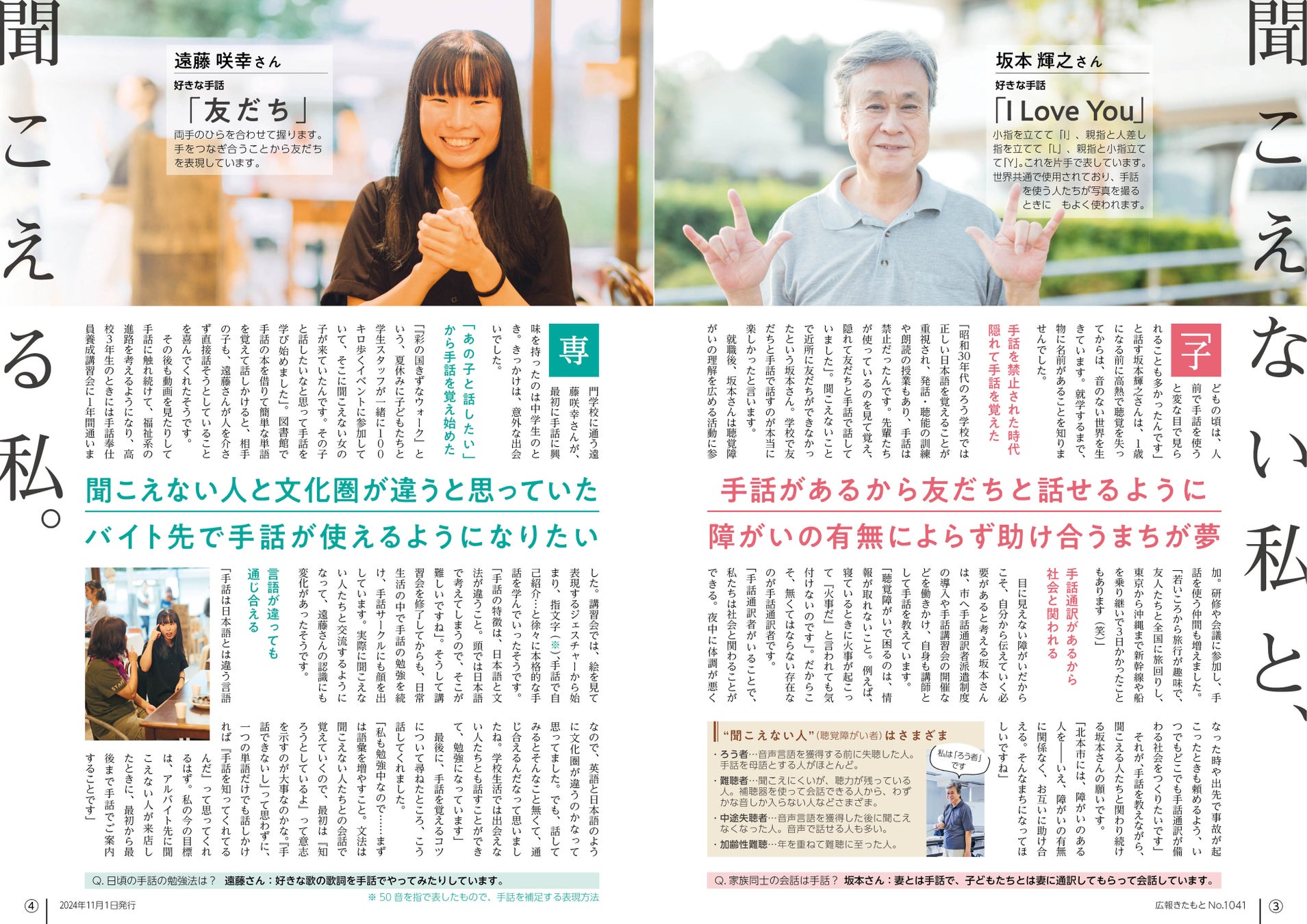 「聞こえない私と、聞こえる私。」と題し、ろう者(音声言語を獲得する前に失聴した人。手話を母語とする)の方と、聞こえない女の子との出会いから手話を学び始めた健聴者の専門学校生の方のインタビューを掲載しています。