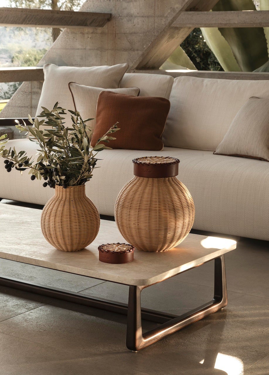 今シーズンは、ロロ・ピアーナ・インテリアのためにラファエル・ナヴォがデザインした、手編みのウィッカーで作られたパームアームチェアの新バージョン、パームウィッカーアームチェアと、フランチェスカ・ランザヴェッキアがデザインした、木材とファブリックを組み合わせた流れるようなオブジェで空間を仕切る独立型の間仕切り本棚〈トラマ〉を発表します。エクステタによるディライトチェア・シリーズには、モジュール式デザインと木製構造のソフトソファと新しいコーヒーテーブルが加わりました。マホガニー材と大理石、ロロ・ピアーナ・インテリアの屋外用ファブリックを使用して、ベランダや明るいガーデンルームに最適な、洗練された屋外リビングエリアを演出します。