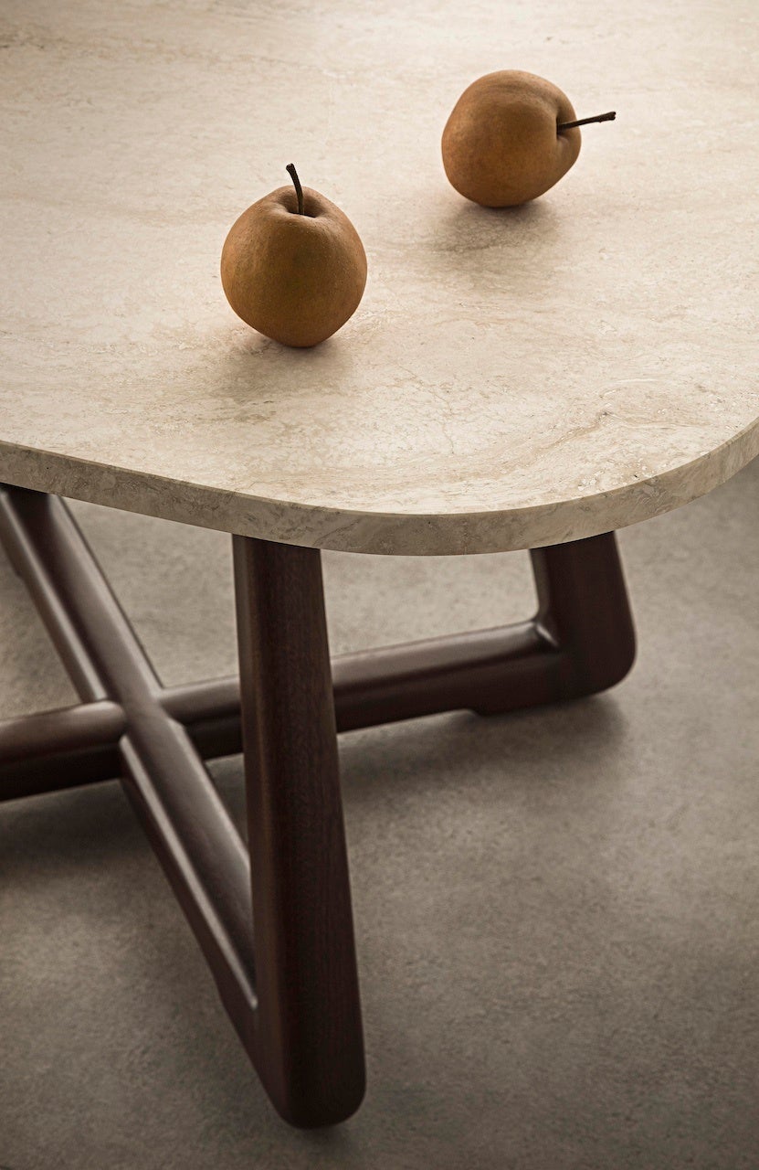 洗練されたリビングエリアを完成させるコレクションには、アームチェアとの組み合わせに最適な、マホガニー材の脚と大理石の天板を備えた正方形のブレックファストテーブルと、正方形と長方形の2種類のコーヒーテーブルがあります。1つはマホガニー材と天板が大理石のタイプ、もう1つは全体がマホガニー製で、上部のパネルはわずかにオフセットされており、パネル間に小さな隙間があるため、より明るい外観になっています。すべて木製のテーブルは、モジュラーソファの座席ユニットと交互に配置することで、便利さを追加することができます。