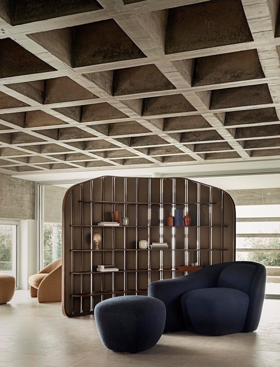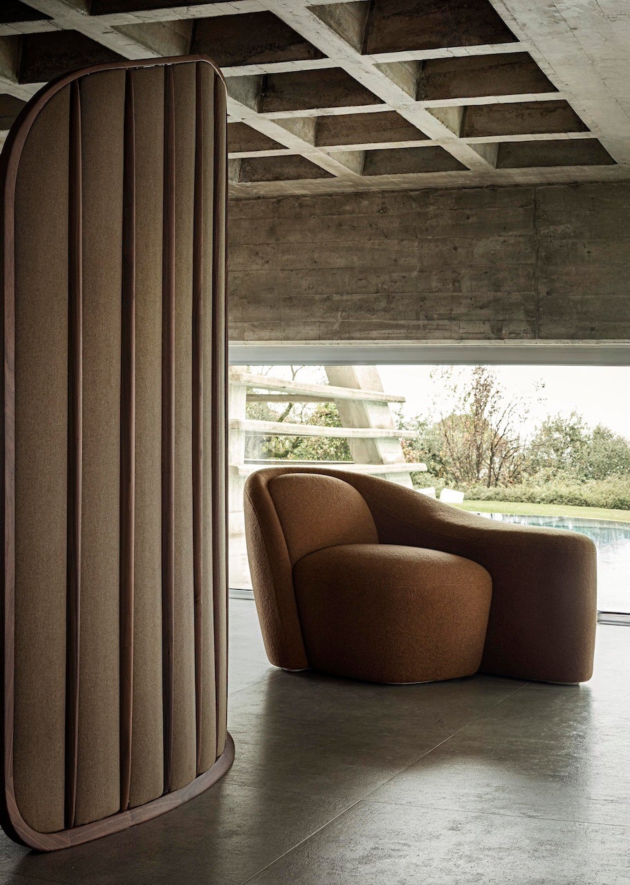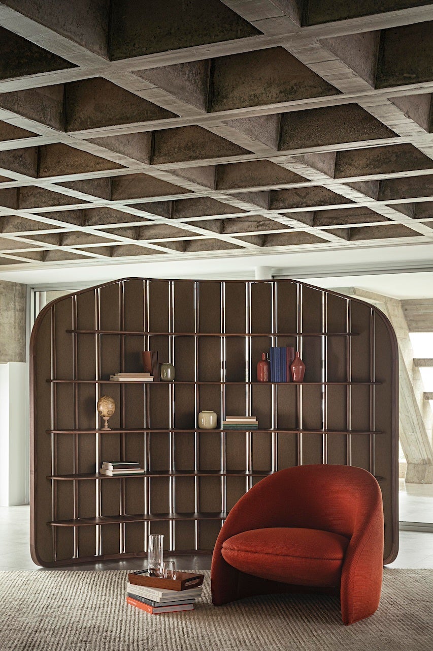 フランチェスカ・ランザヴェッキアの作品〈トラマ〉は、曲線的で流れるようなフォルムが特徴的な、独立型の間仕切り本棚。緩やかな曲線を描くことで、光と空気の自然な流れが生まれ、異なる空間をつなぐポイントを作り出します。柔らかなファブリックパネルと、熟練の職人技が光るウォールナット無垢材の棒が交互に配置され、木とファブリックの空間によって、堅固さと柔らかさ、ボリュームと空間の交互の対話が生まれます。