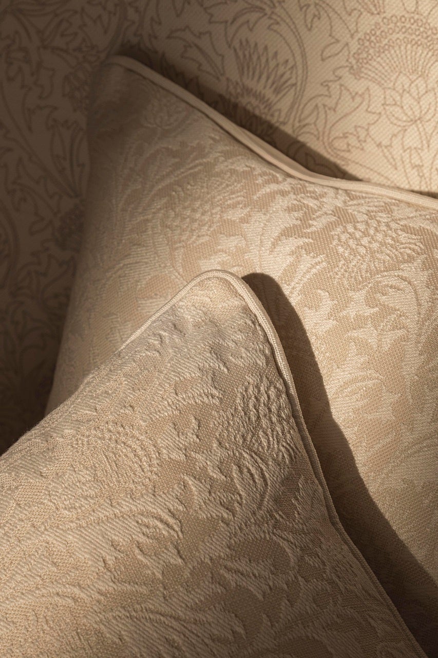 アザミの花は難燃性で、水、塩分、塩素、日光に耐える屋外用ファブリックにも施されています。製造工程で出る廃棄物をリサイクルしたポリエステルを使用し、しなやかで丈夫なサステイナブルな糸に加工することで、驚くほど柔らかく包み込むような質感で、コットンの手触りを彷彿とさせます。