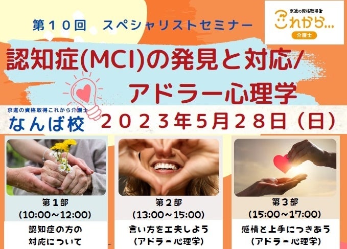 京進の資格取得これから介護士(旧「介護のキャンパス」、以下これから介護士)では、介護に関する各分野のスペシャリストによる公開講座「スペシャリストセミナー」を、2023年5月28日(日)に行います。第10回となる今回は、「認知症(MCI)の発見と対応/アドラー心理学」がテーマです。スペシャリストセミナーでは、介護や福祉に関する就業者の方だけでなく、自分自身や家族、周囲の方との関わりについて、一般の方にとっても、“知っていると役立つ様々な知識”を、昨年8月より伝授しています。