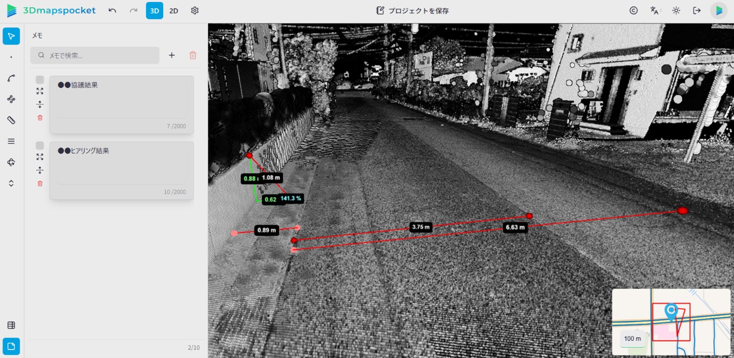 「3Dmapspocket®」(スリーディーマップスポケット)は、当社が取得した全国の高速道路/自動車専用道路と主要幹線道路の3次元点群データを確認・分析可能なデータプラットフォームです。このたびのアップデートでは、分析結果や関連情報などを記録するメモの登録機能、ならびにこうしたメモおよび距離や勾配の計測結果などをプロジェクトとして保存する機能を実装しました。これらの機能により関係者との情報共有をよりスムーズにし、業務の円滑な進行をサポートします。
