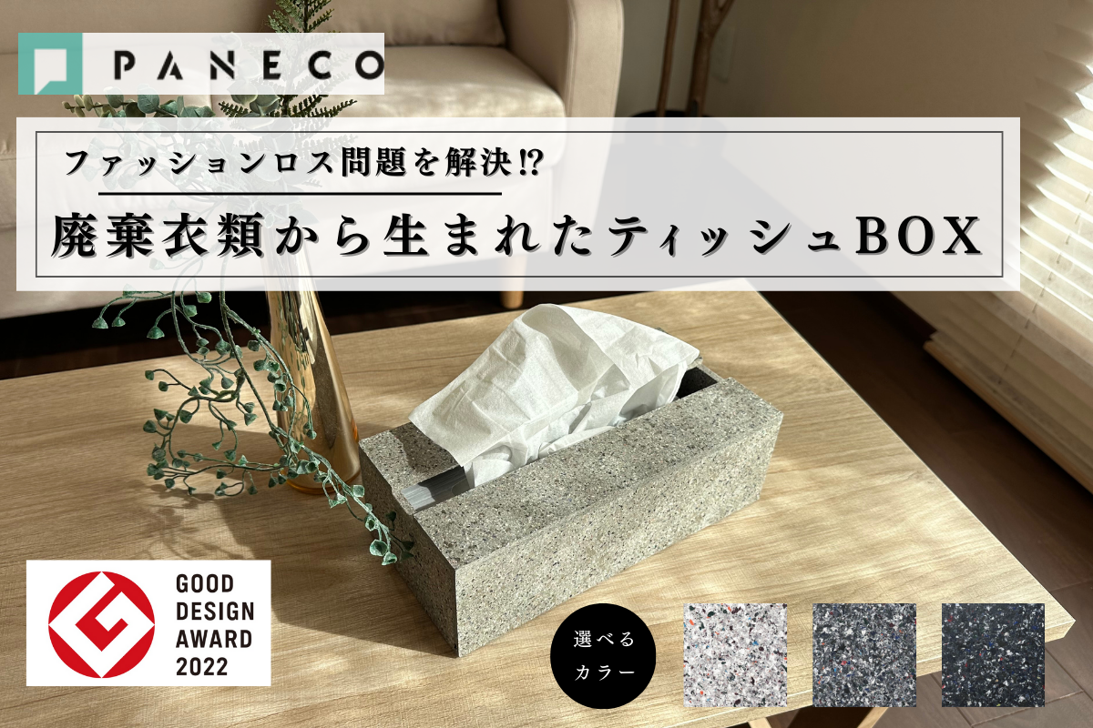 これまで「PANECO」は、アパレルブランドや商業施設で内装材や什器として使用されてきましたが、一般の方々に手に取っていただく機会があまりなかったため、だれでも身近なものからSDGsに取り組めるよう、今回第一弾として「PANECOティッシュBOX」を開発しました。