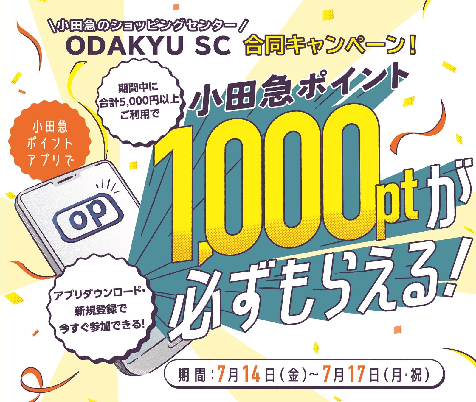 期間中、対象ショッピングセンターで小田急ポイントアプリをご提示*1&合計5,000円以上*2ご利用の方全員に、キャンペーン終了後小田急ポイント1,000ポイントをプレゼント!