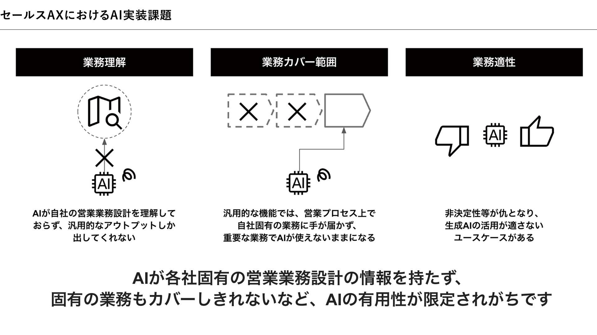 多くの企業において生成AIの導入が進む一方で、セールスAXは様々な壁にぶつかり、停滞・失敗しています。