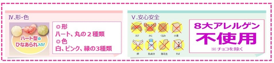ハート型・丸型の2種類、色は白・ピンク・緑の3種類。チョコひなあられを除き8大アレルゲン不使用