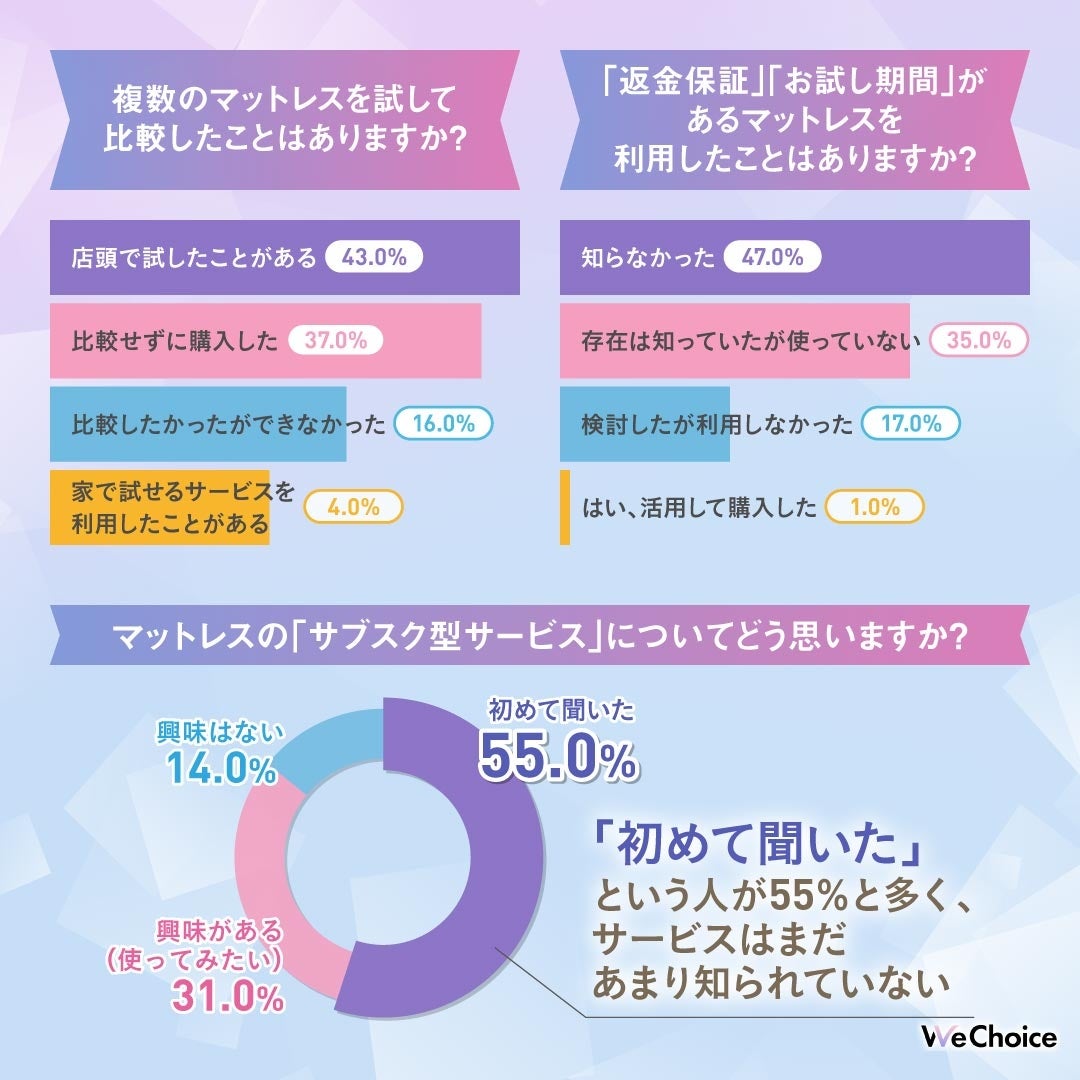 【複数のマットレスを試して比較したことはありますか?/「返金保証」「お試し期間」があるマットレスを利用したことはありますか?/マットレスの「サブスク型サービス」についてどう思いますか?】