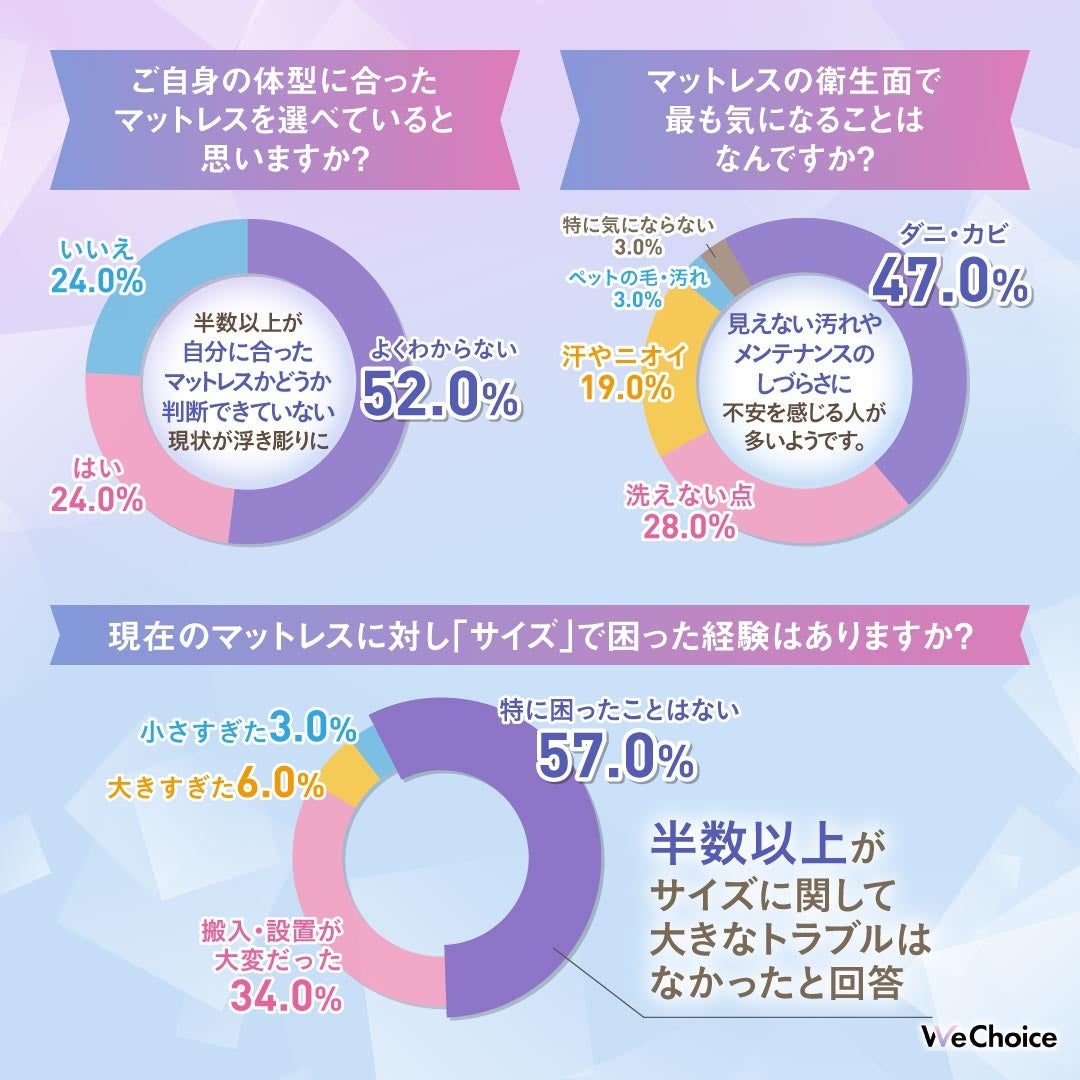 【ご自身の体型に合ったマットレスを選べていると思いますか?/マットレスの衛生面で最も気になることはなんですか?/現在のマットレスに対し「サイズ」で困った経験はありますか?】