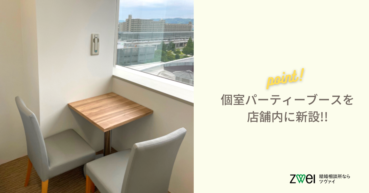 今回のリニューアルでは、北陸エリアにおける婚活パーティー需要に対応するため、個室パーティーブースを両店舗ともに新設しました。ツヴァイ金沢店は最大16名のお客さまが参加できる8つのブース、ツヴァイ富山店は最大12名のお客さまが参加できる6つのブースを設置します。結婚相談所ツヴァイが運営するパーティーのため、結婚への真剣度の高い参加者が多く、企画も多種多様です。感染症予防対策も徹底しておりますので、安心してご参加ください。