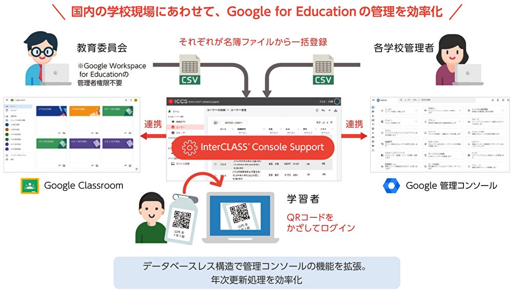 『InterCLASS® Console Support』は、Google 管理コンソールの機能を拡張することができる Google Workspace™︎ に対応したアプリケーションです。Google 管理コンソールと連携して、学校のユーザー・グループの一括管理やデバイス管理、Google Classroom のクラス設定などの作業を簡単かつ速やかに行うことが可能。