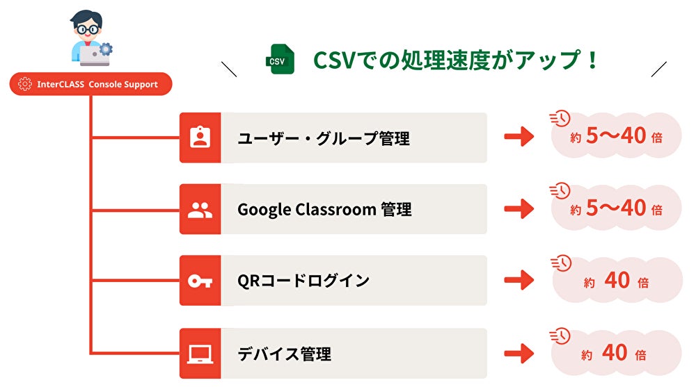 一方で、Chromebook の運用管理は、従来のコンピュータの管理とは異なり、ユーザーアカウントをベースに管理します。そのため、Google Workspace for Education のアカウント管理が特に重要であり、毎年の年次更新におけるユーザーアカウントの組織移動や貸し出し端末の管理の煩雑さが新たな課題となっています。こうした状況を踏まえ、教職員の業務負荷をさらに軽減するべく、『InterCLASS® Console Support』でのバッチ処理の高速化に対応いたしました。