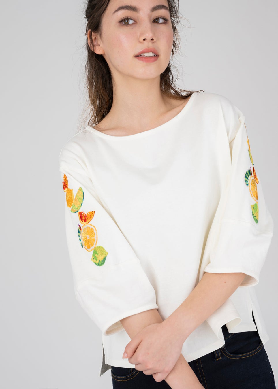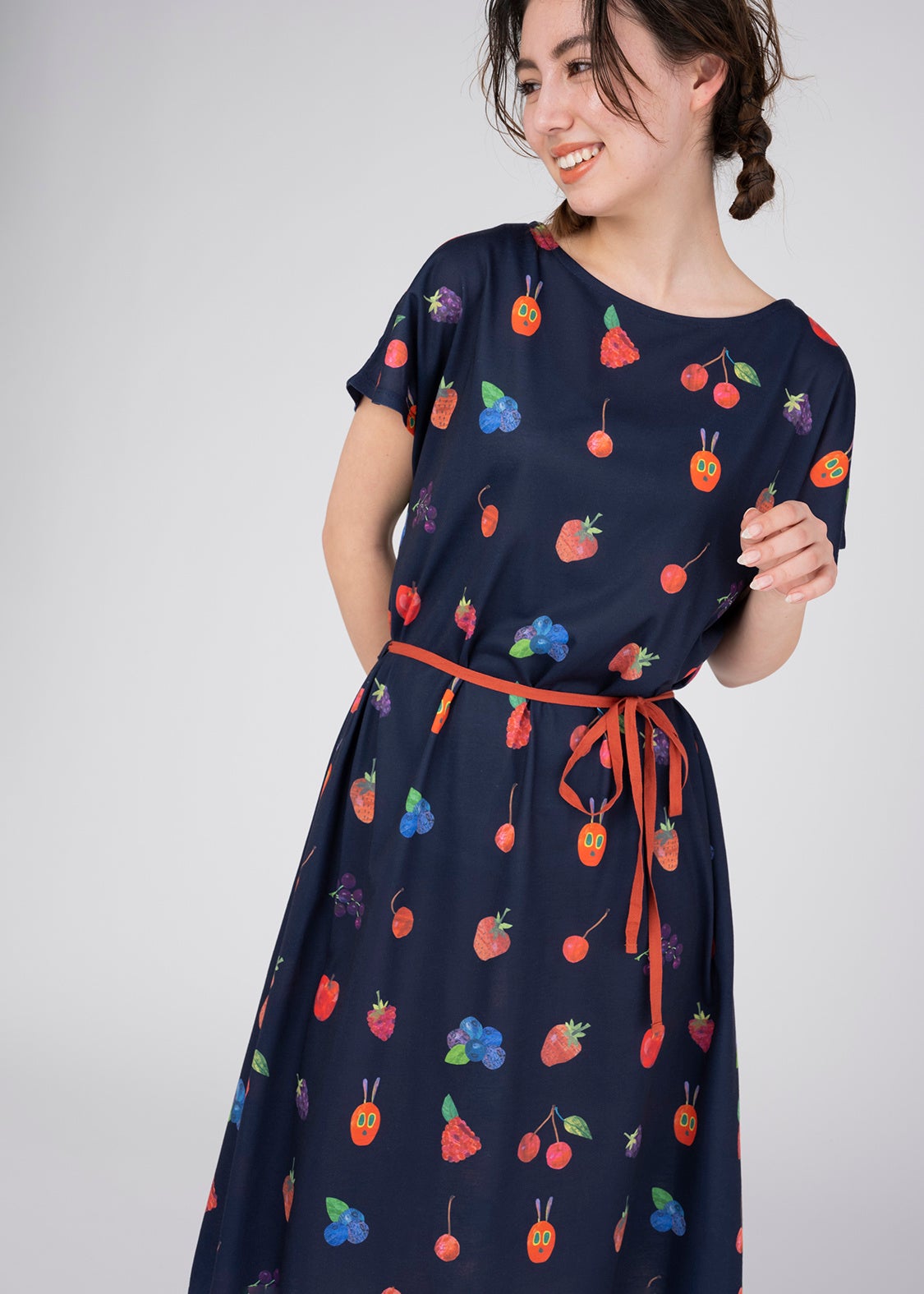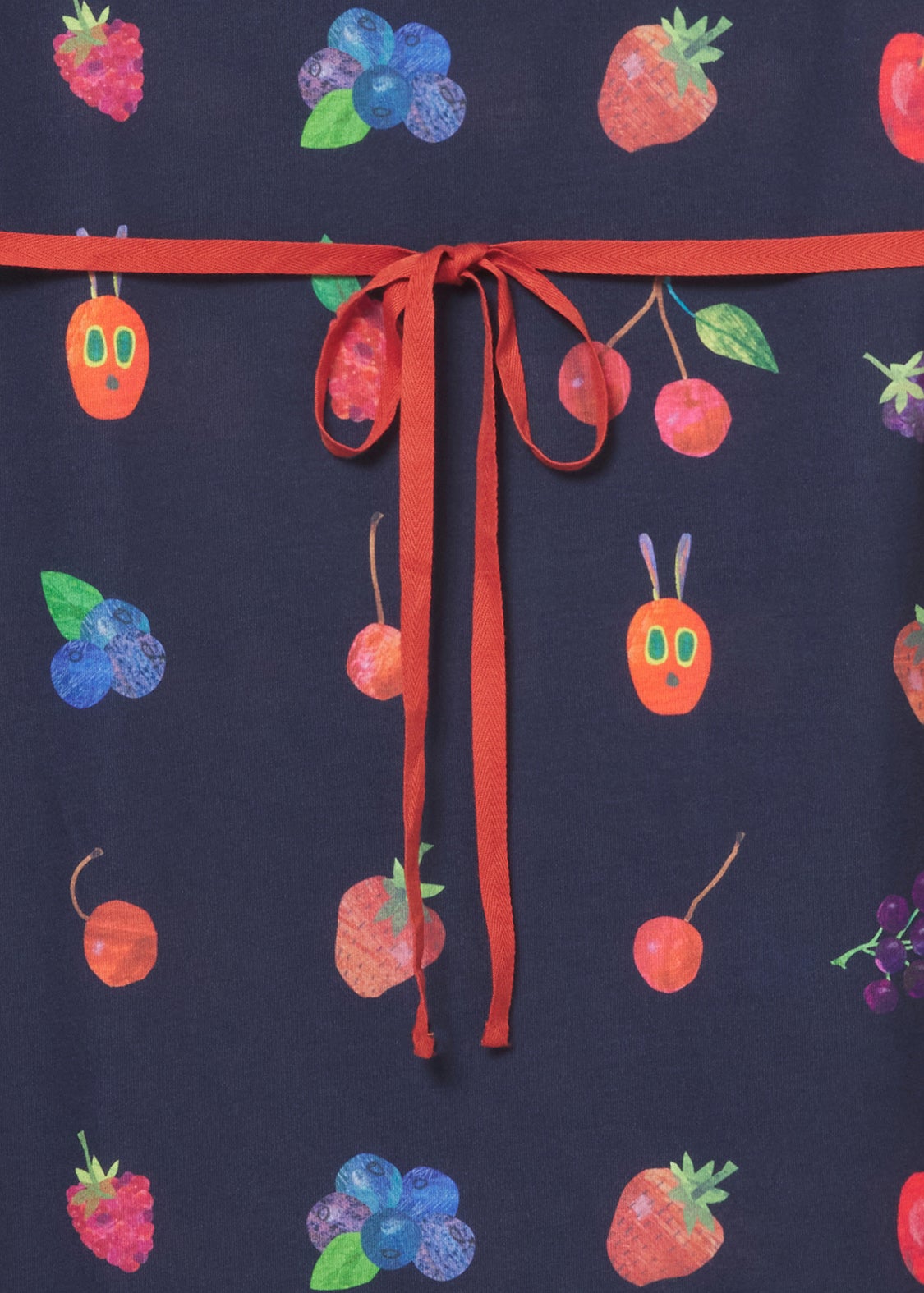 レモンやライム、オレンジなど、瑞々しい柑橘系のフルーツを袖に並べた爽やかなデザイン。フルーツの上にははらぺこあおむしの姿が。