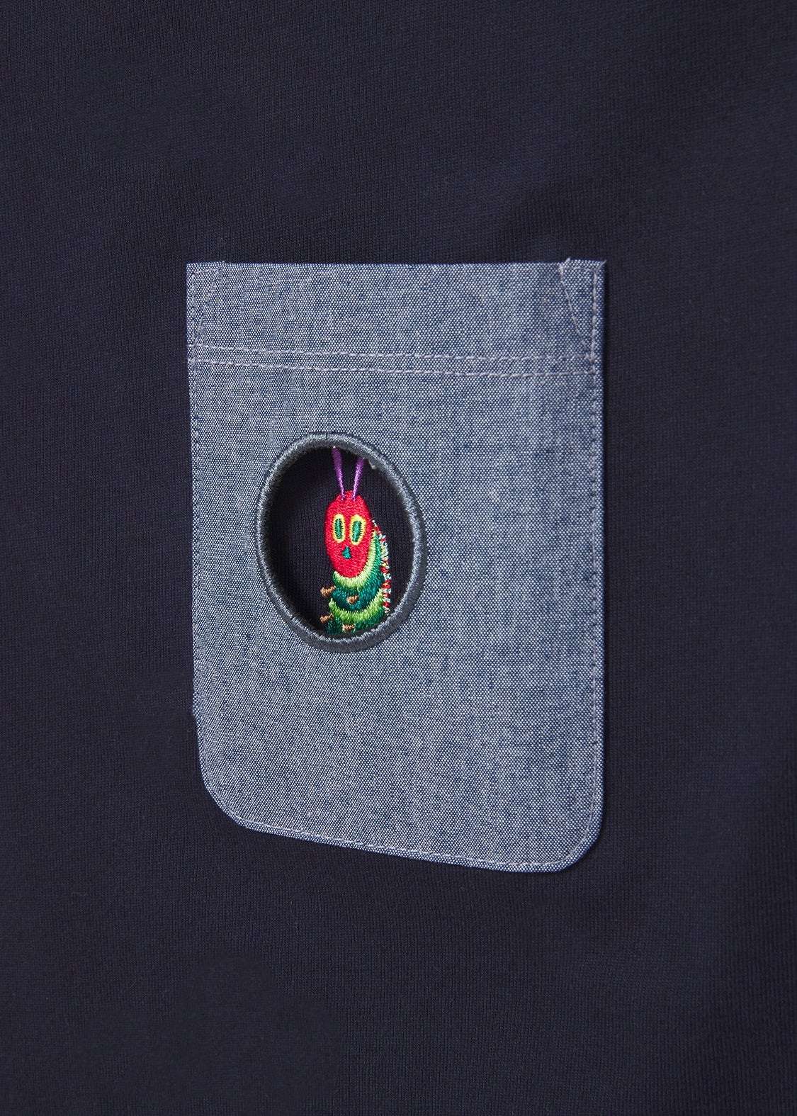 ポケットの穴から顔を出したり、丸くなって寝ている、様々な姿のはらぺこあおむしを刺繍にしたデザイン。