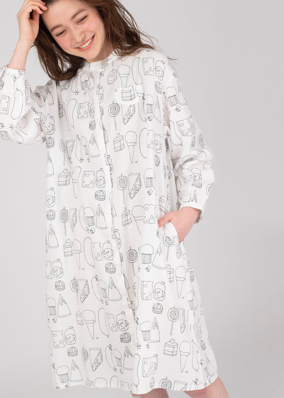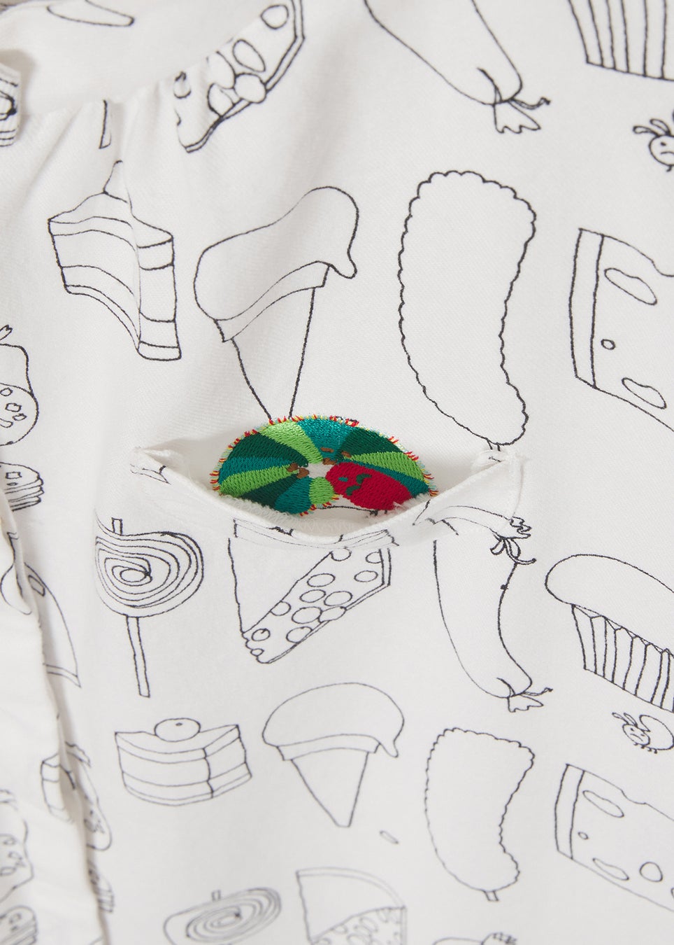 チョコレートケーキ、アイスクリーム、チーズやサラミなど、『はらぺこあおむし』に登場する食べ物をスケッチ風のパターンデザインにしました。胸元のポケットを覗くと、丸くなって眠るはらぺこあおむしが刺繍されています。