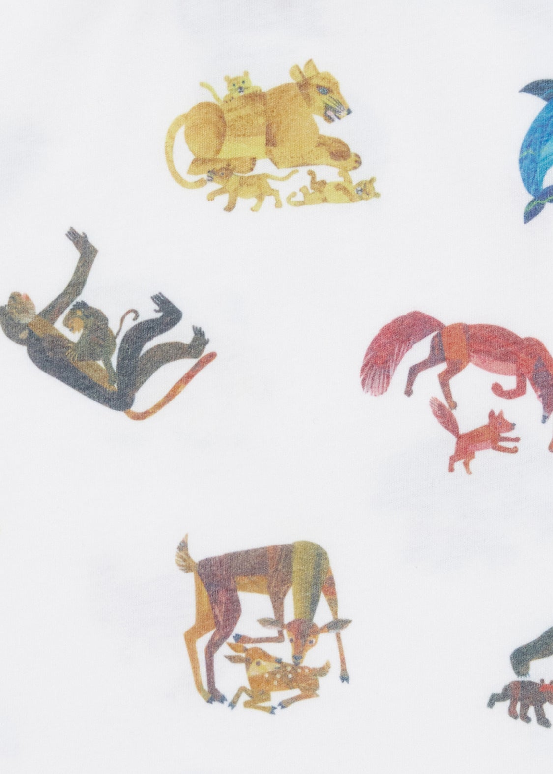 キリン、キツネ、ゾウ、サルなど、親子で描かれた動物たちが散りばめられたパターンデザイン。