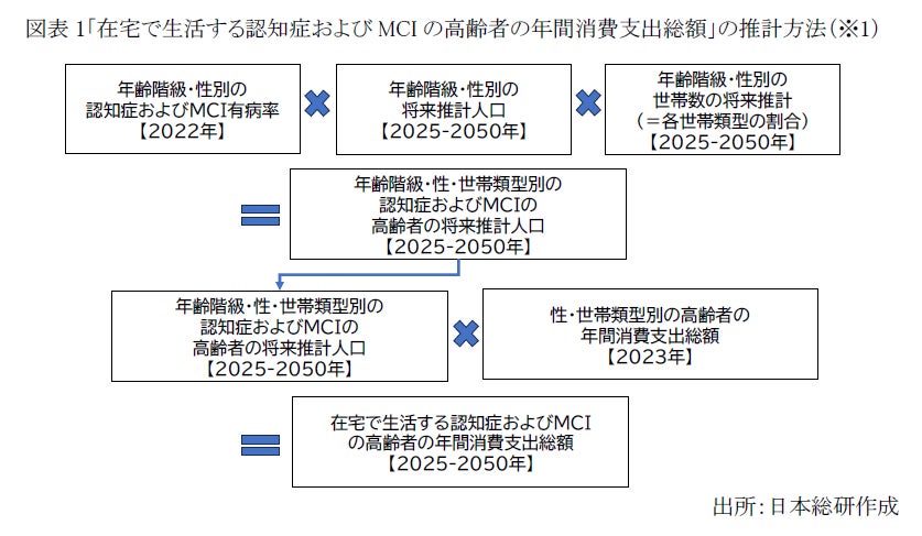 「在宅で生活する認知症およびMCIの高齢者の年間消費支出総額」は、図表1にまとめた方法を用いて推計しました(推計方法の詳細はレポートP6-8を参照ください)。