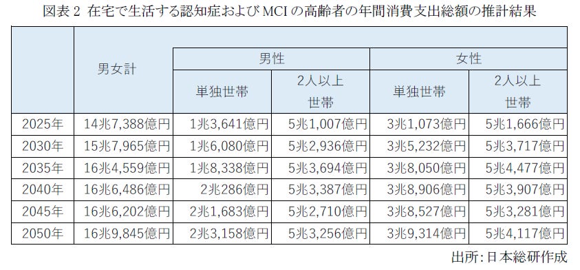 株式会社日本総合研究所(本社: 東京都品川区、代表取締役社長: 谷崎勝教、以下「日本総研」)は、2050年までの期間における「在宅で生活する認知症およびMCI(軽度認知障害)の高齢者の年間消費支出総額(=購買力)」と、「認知症になってからも使いやすい製品・サービスの市場規模」の推計を行いました。その結果および分析・提言を「認知症1200万人時代へ。ともに生きる社会における市場の可能性とは?」(以下「本レポート」)として取りまとめましたので発表します。