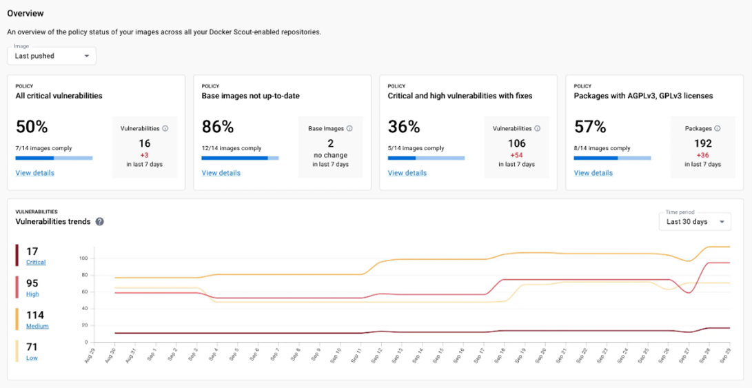 Docker Scout Dashboard は、組織内のイメージの分析をチームで共有するのに役立ちます。開発者は、Docker Hub と Artifactory の両方から、すべてのイメージにわたるセキュリティ ステータスの概要を確認し、簡単に修復の推奨事項を得ることができます。セキュリティ、コンプライアンス、運用などの役割のメンバーが、どのような脆弱性や問題に注力すべきかを知るのに役立ちます。