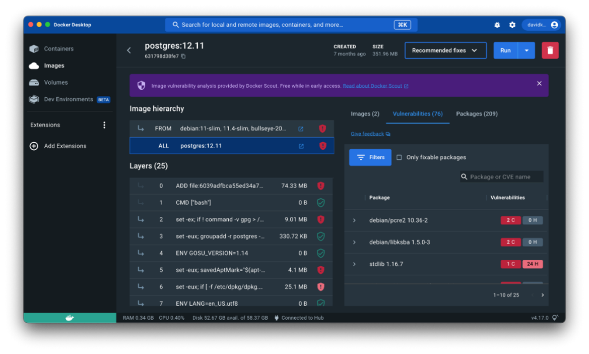 Docker Scout は、Docker Desktop のローカルに保存されたすべてのイメージを分析し、イメージをビルドする際に最新の脆弱性情報を提供します。