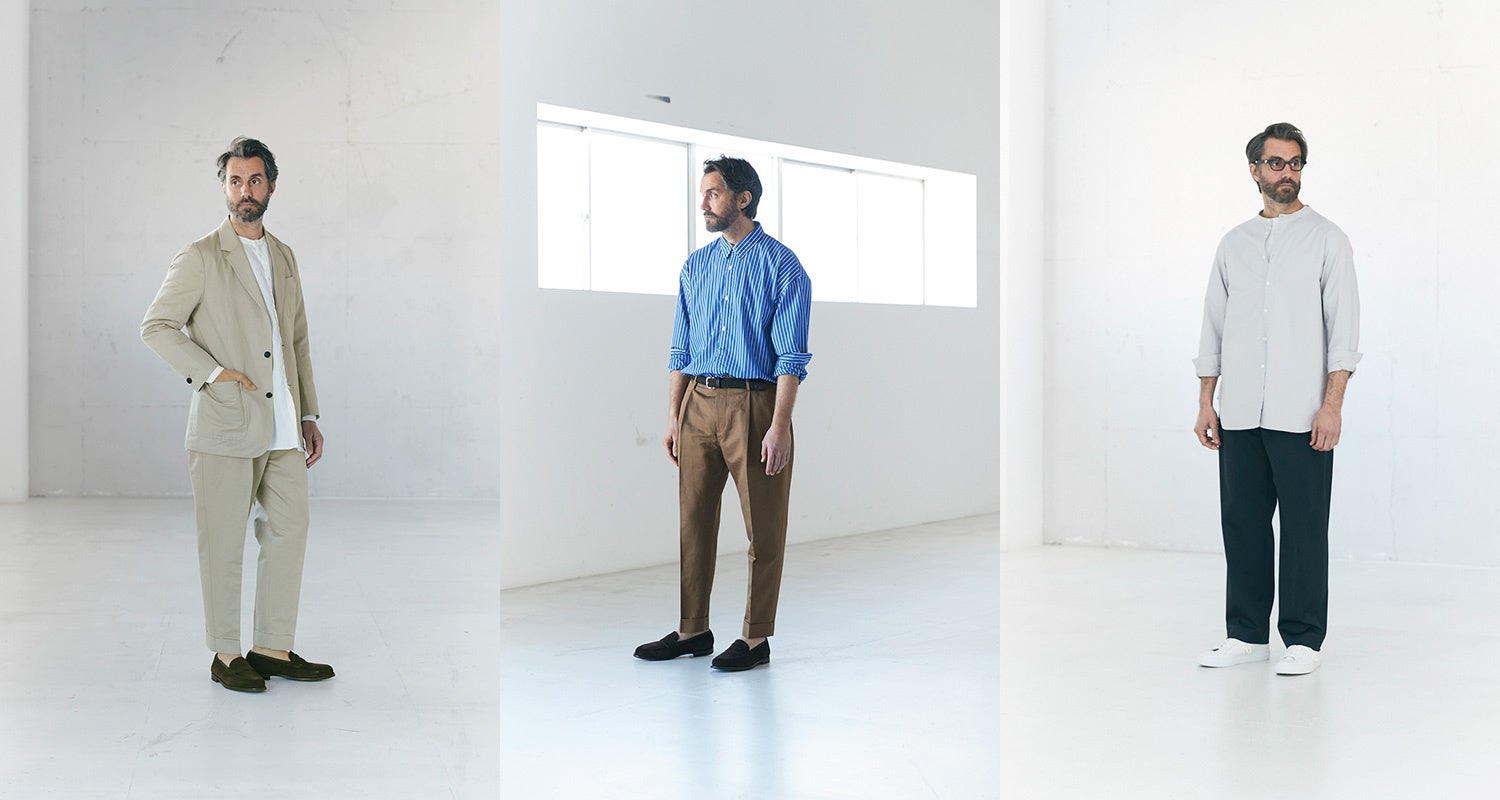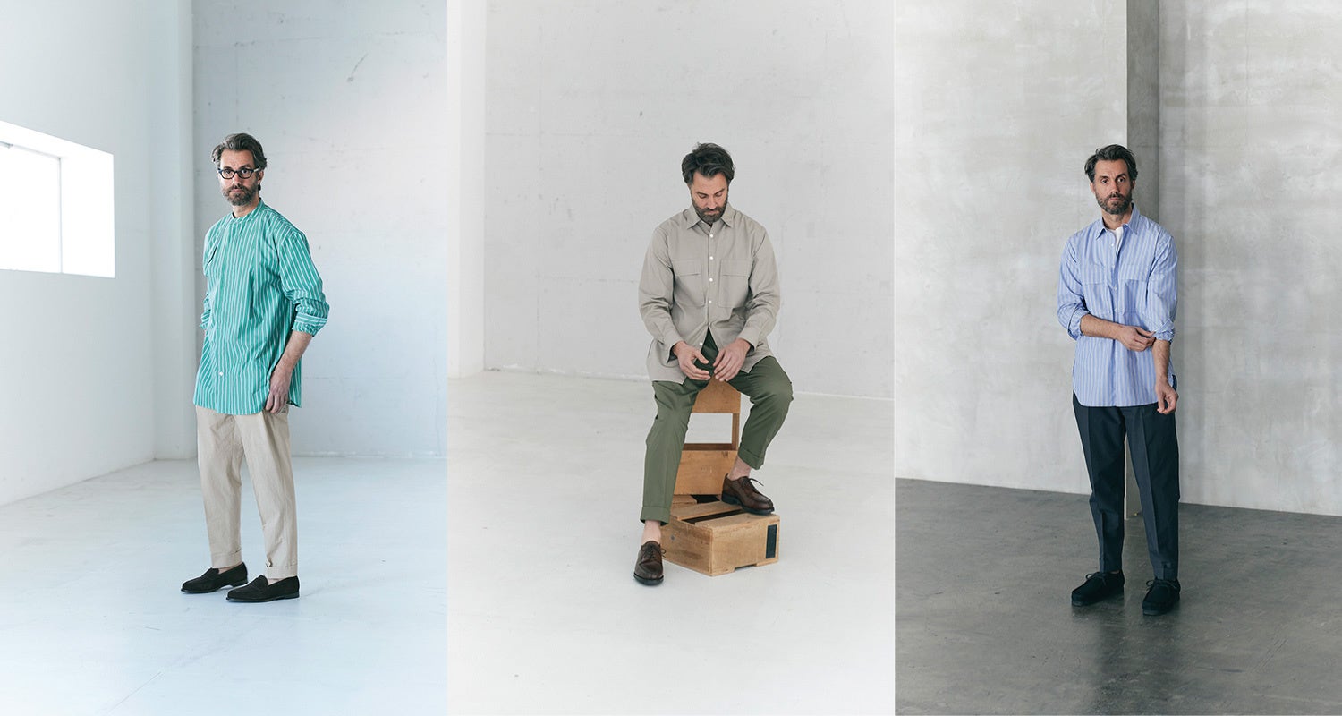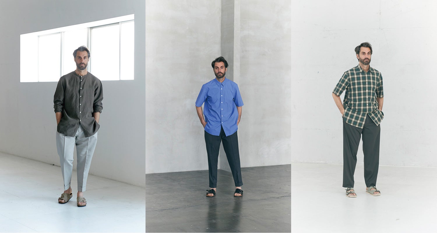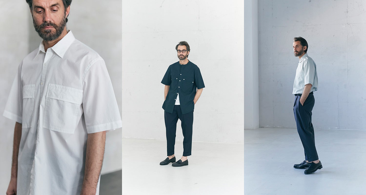 今シーズンはミリタリーやスリーピングシャツをイメージしたロングシャツや小さな襟と前立てに入るステッチが特徴の半袖シャツなどシャツ3モデル、ドレス工場で仕立てる端正な顔立ちのイージーパンツ1モデルが新作として登場します。
