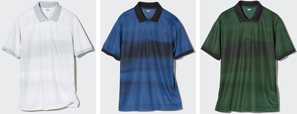 ホワイト&グレー、ブルー&ブラック、グリーン&ブラックのグラデーションを施した3色のボディとソリッドカラーをあしらった襟袖のデザインが、スポーティでエレガントな一枚。「ドライEX」素材の優れた速乾性は、錦織選手の高いパフォーマンスをサポートすると共に、アクティブなスポーツにも、また普段着としても幅広く活躍します。