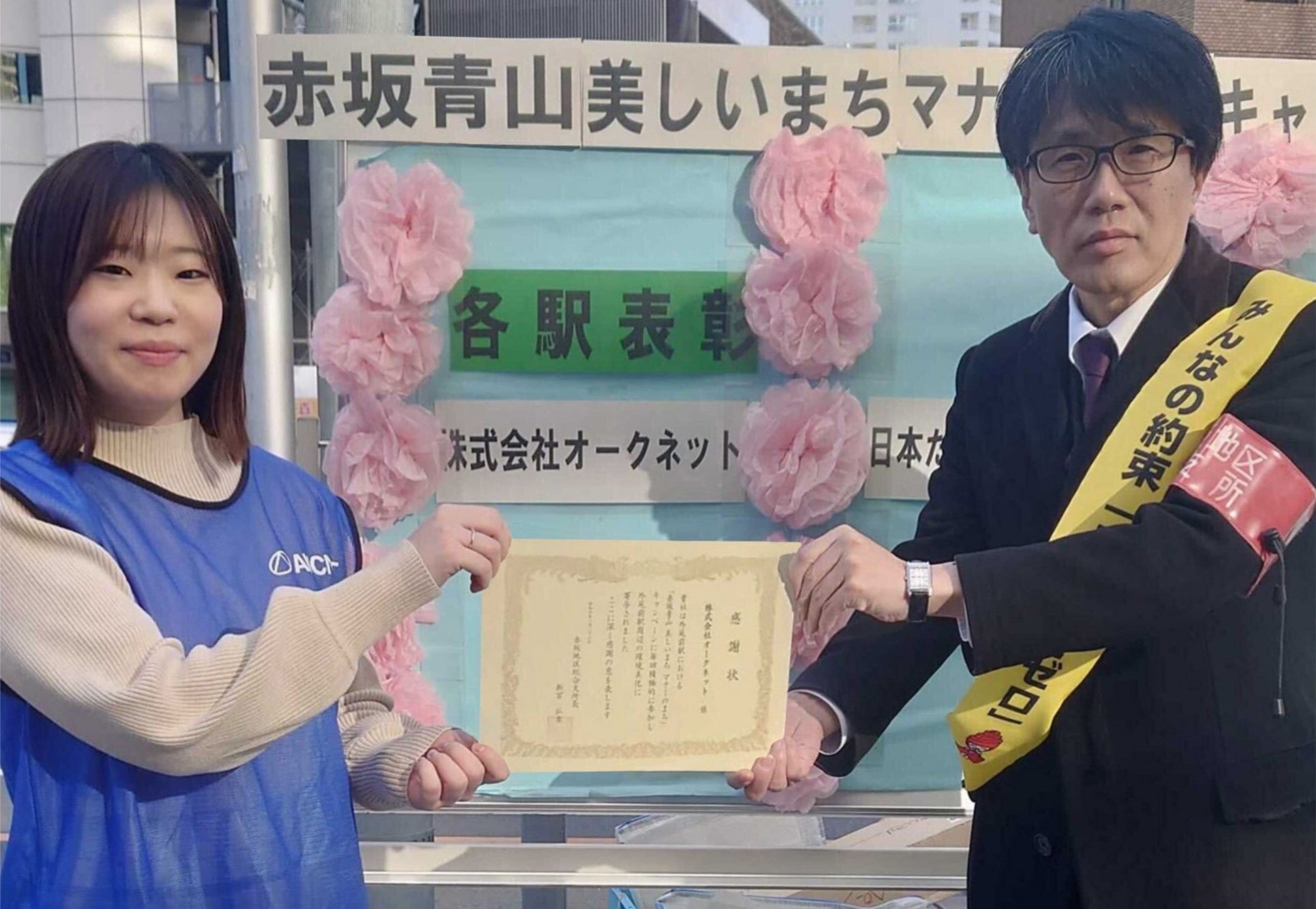 オークネットは赤坂・青山エリアの企業の一員として本キャンペーンに賛同し、2016年※1から外苑前駅を中心とした清掃活動に参加しており、このたびこれまでの継続的な活動への参加に対して、感謝状を授与されました。