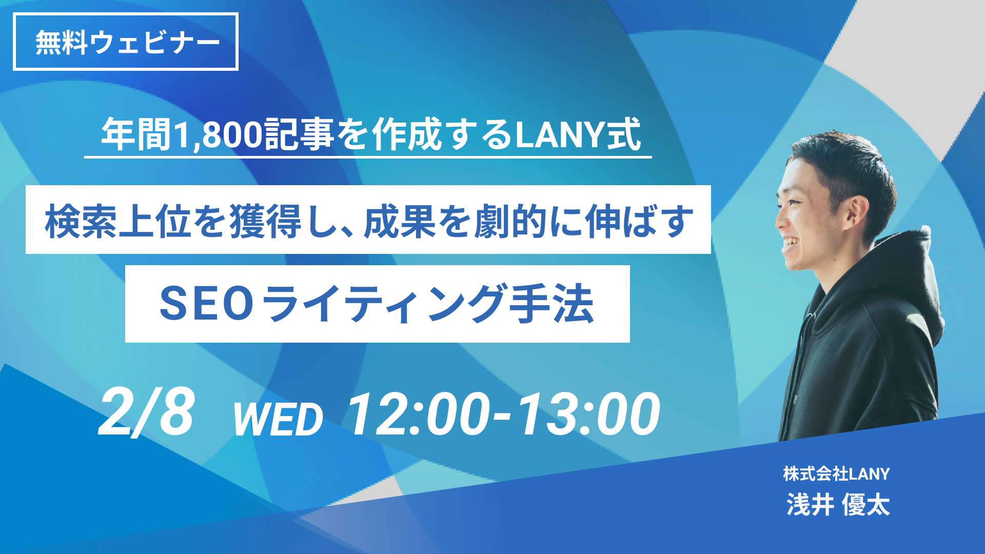 デジタルマーケティング支援を提供する株式会社LANY(東京都渋谷区、代表取締役社長:竹内渓太)は、年間1,800記事を作成するLANY式 – 検索上位を獲得し、成果を劇的に伸ばすSEOライティング手法を解説するウェビナーを2/8(水)に開催いたします。