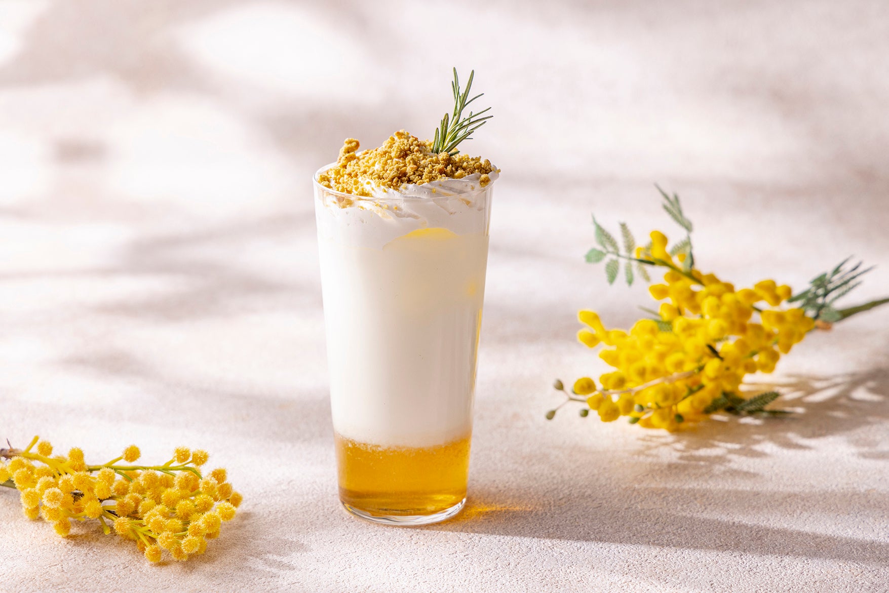 エルダーフラワーの香りづけをしたトロピカルグリーンティーをミルクアップ。トップのホイップクリームには、ミモザに見立てた黄色のスポンジケーキをふんわりと乗せました。