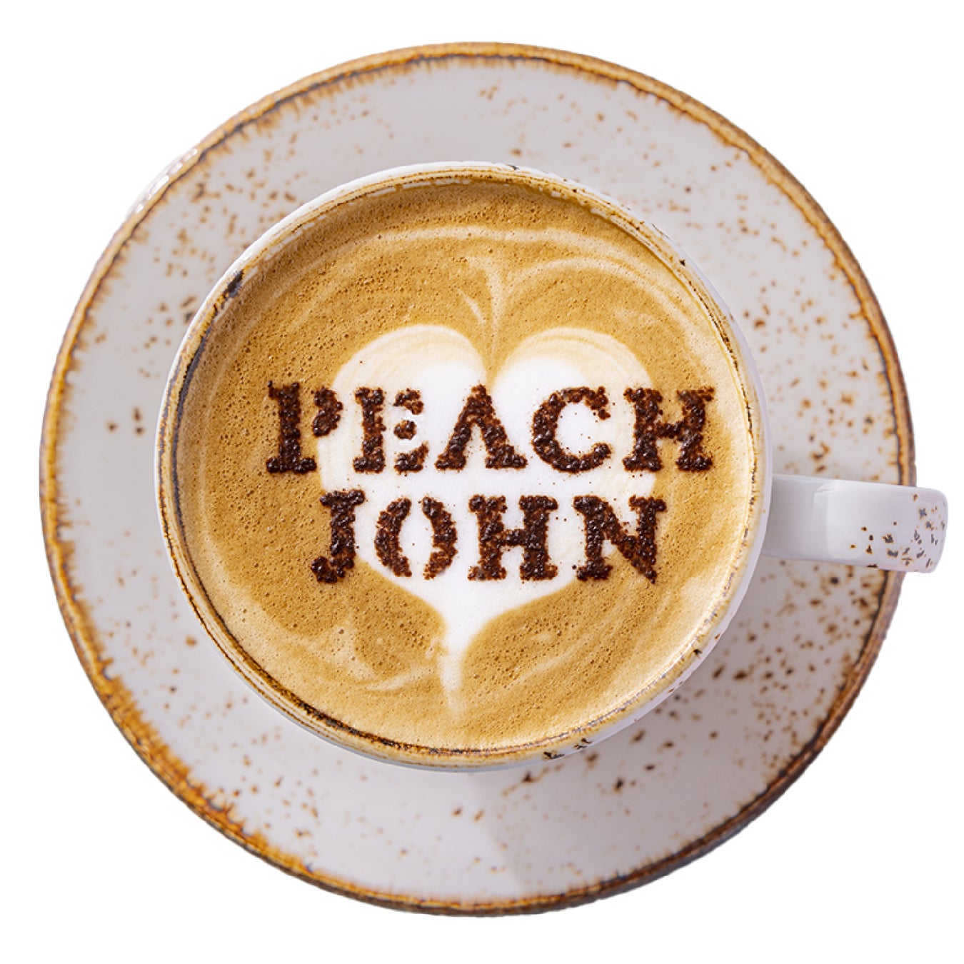期間中はカフェのホットラテメニューに+100円でピーチ・ジョンロゴをプラスできます。ご希望の方はお気軽にスタッフへお声がけください。