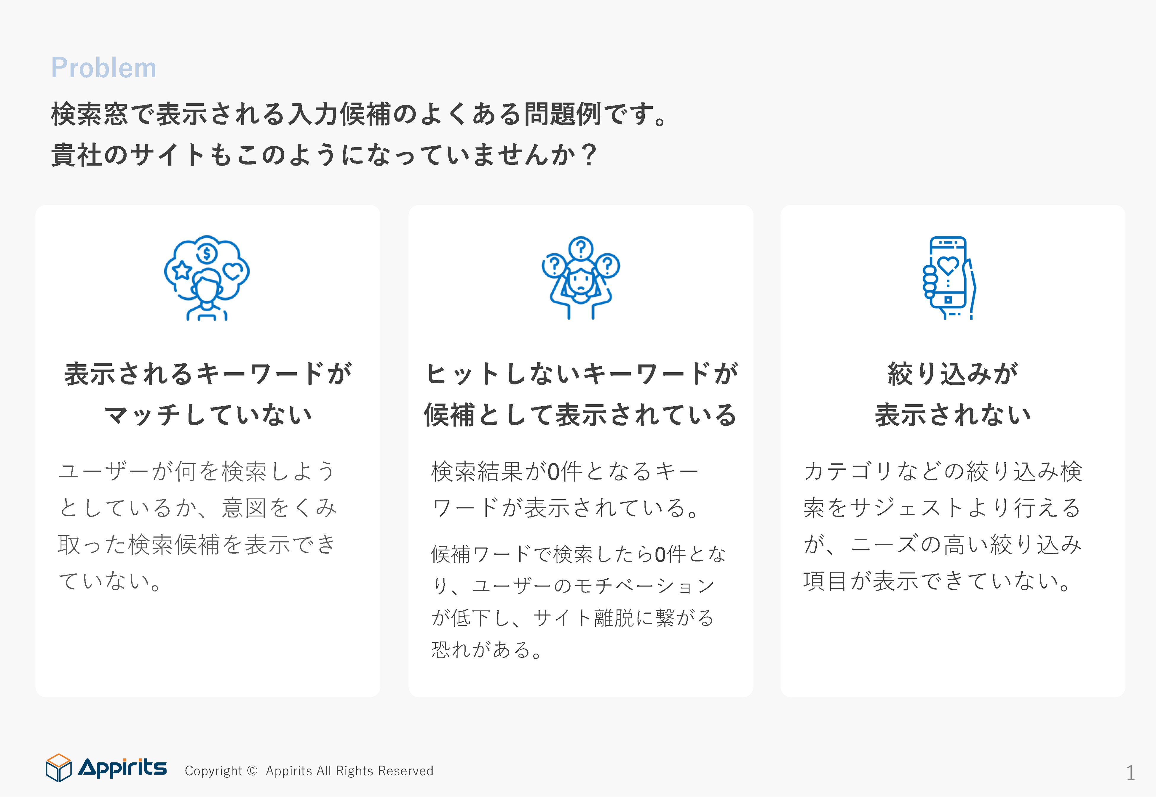 株式会社アピリッツ(本社:東京都渋谷区、代表取締役社長執行役員CEO:和田 順児)は、サイト内検索およびWebプッシュ通知の運用における課題解決を目的として、サイト内検索の入り口となるサジェストの最適化を実現したい方、ならびにWebプッシュ通知の効果を最大化するために許可率を向上させたい方を対象に、ホワイトペーパーを2点公開いたしました。ECの購入率向上に役立つサジェストの活用ポイントや重視すべき機能、Webプッシュ通知で効果を最大化するためのオリジナルダイアログ機能についてご紹介しております。ぜひご覧ください。