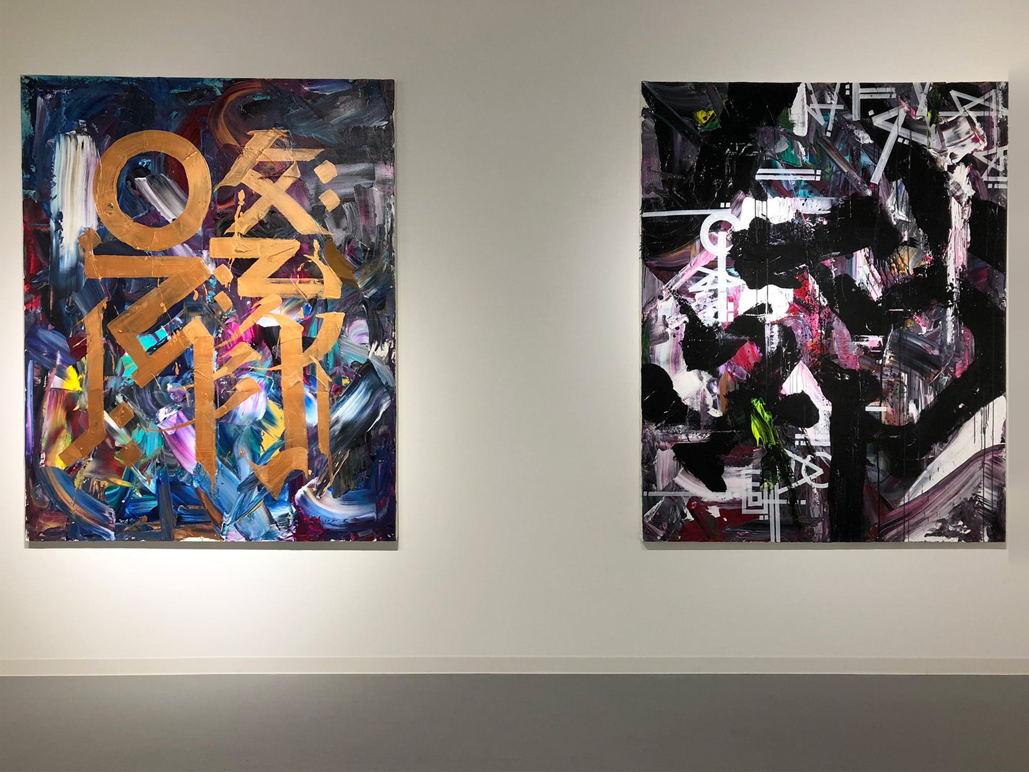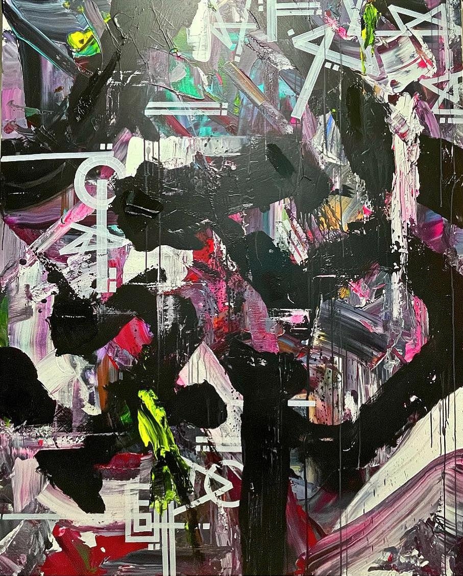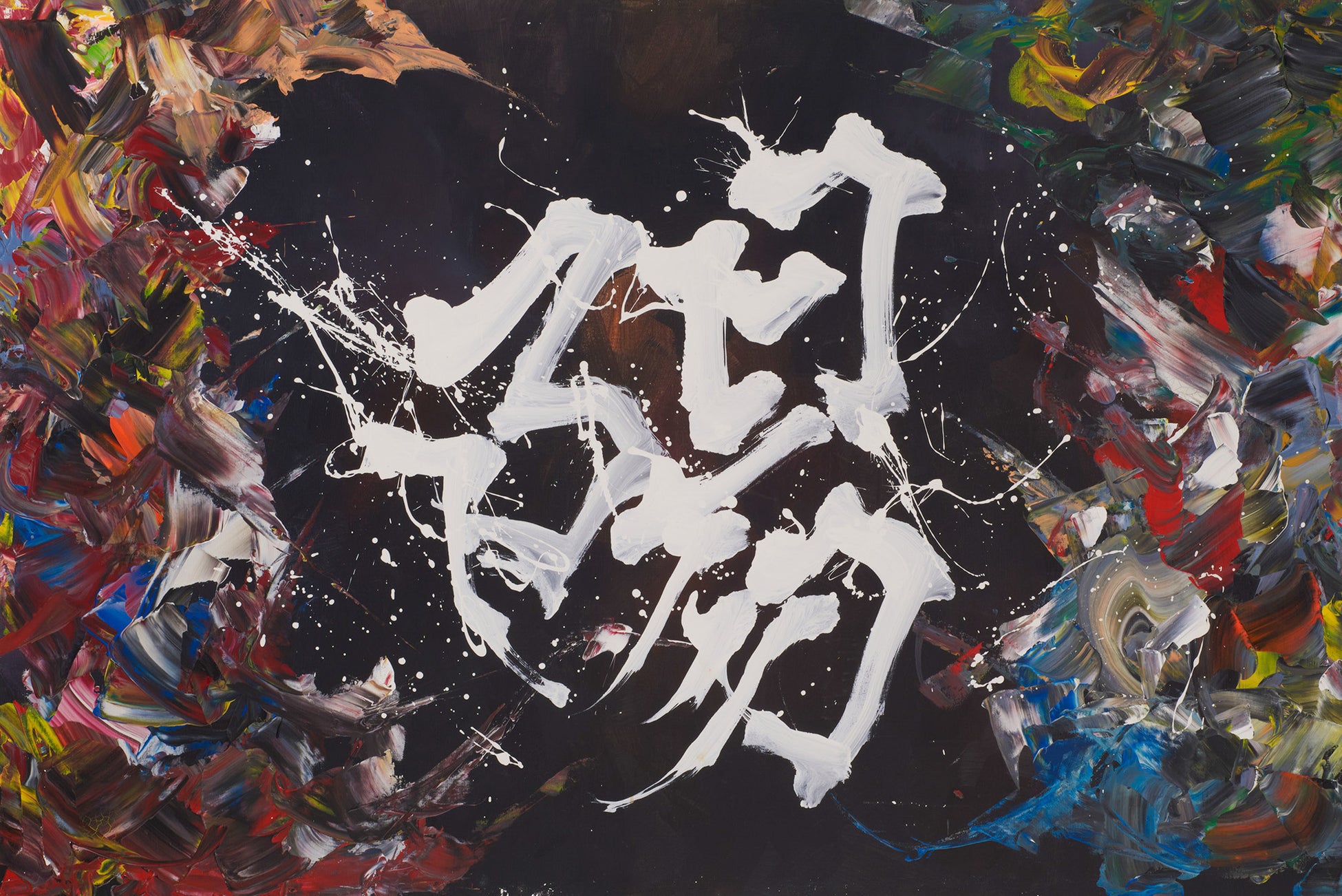 書道を教えている母親の影響で8歳から書道を始めたアーティスト真弓将。書をバックグラウンドにした創作活動に一貫するテーマは「滲み出る生命」。3000年以上にわたり生き続ける漢字に生命を感じ取り、溢れる感情や色彩を可視化するべく墨のみならずアクリル絵具を使い、言葉から立ち上がってくる風景を描いています。