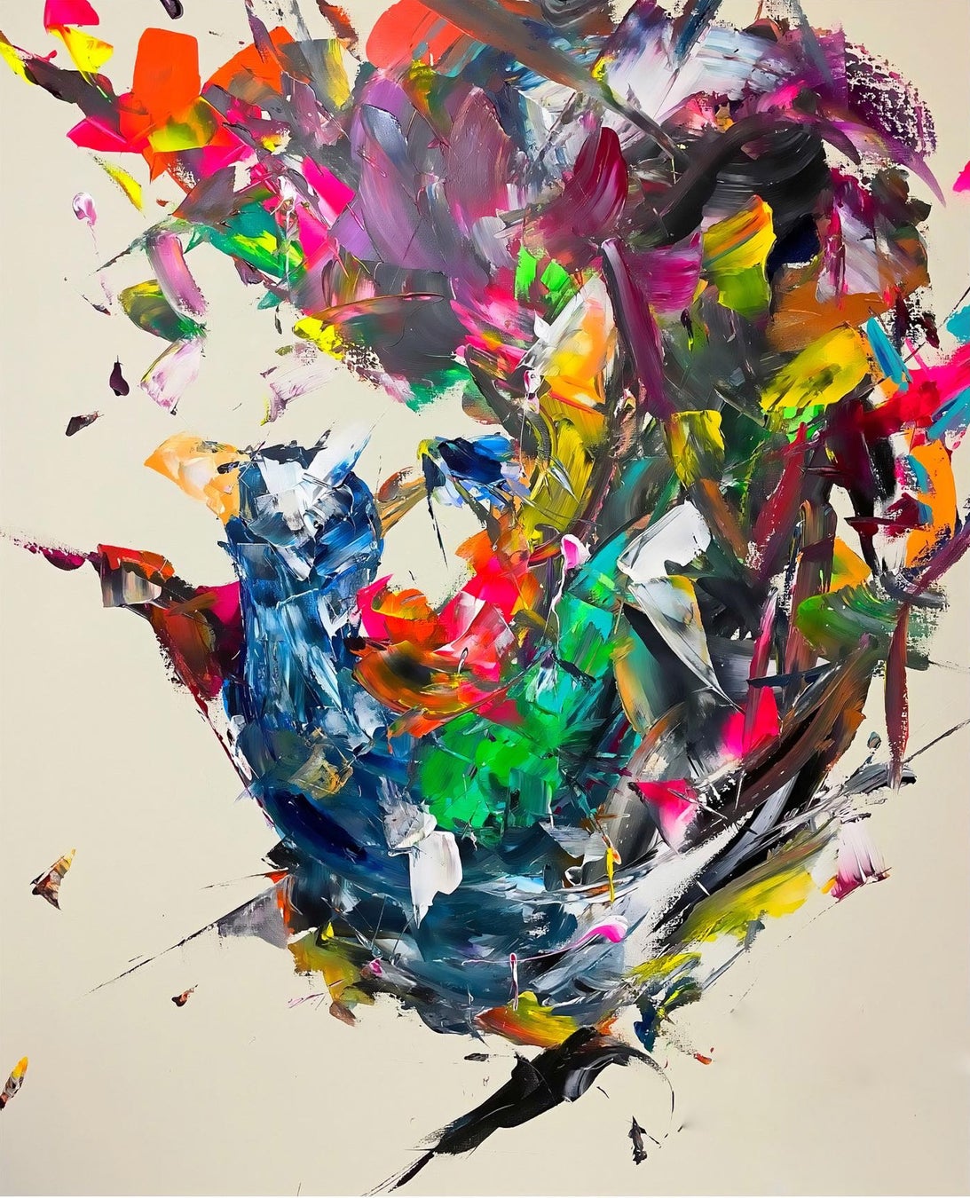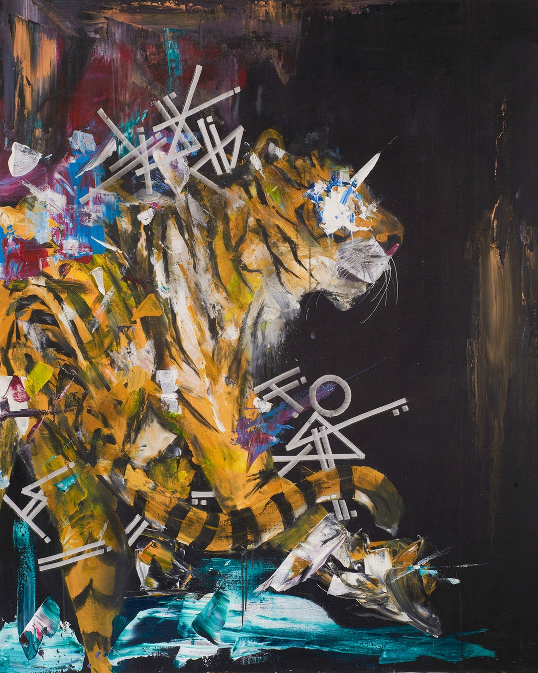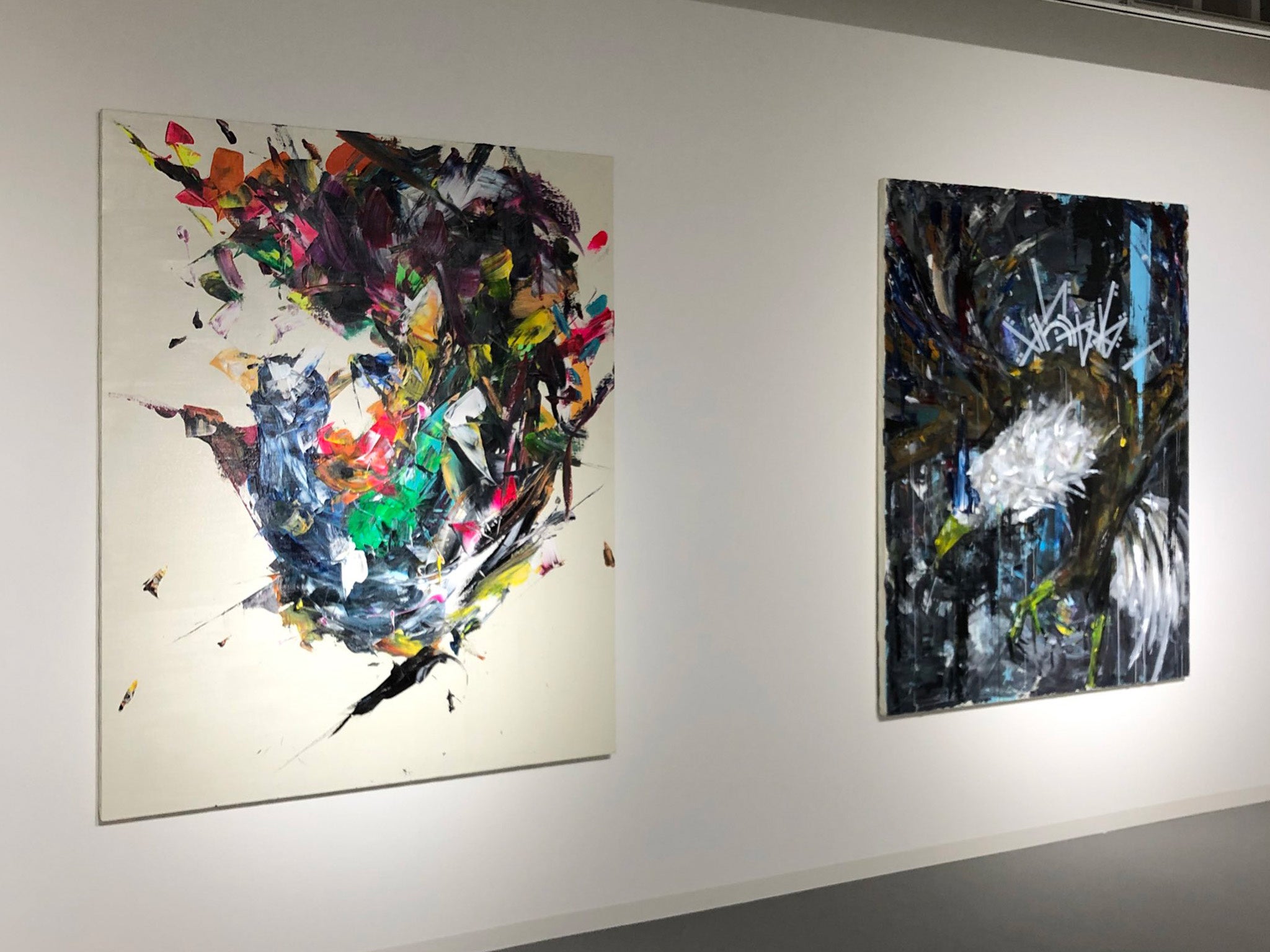 書道を教えている母親の影響で8歳から書道を始めたアーティスト真弓将。書をバックグラウンドにした創作活動に一貫するテーマは「滲み出る生命」。3000年以上にわたり生き続ける漢字に生命を感じ取り、溢れる感情や色彩を可視化するべく墨のみならずアクリル絵具を使い、言葉から立ち上がってくる風景を描いています。