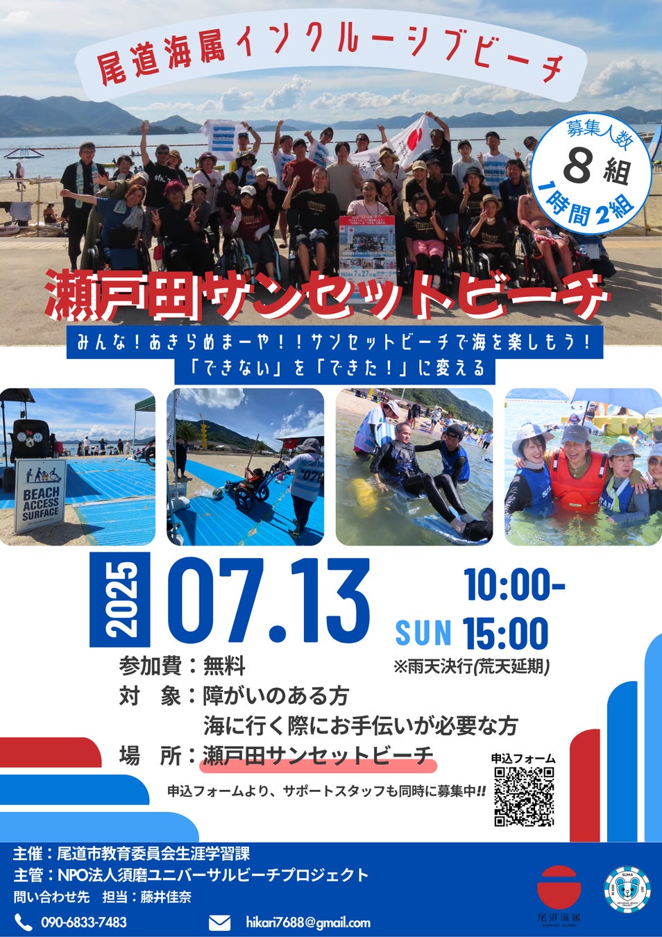 障がいがある人もない人もみんなが一緒に楽しめるビーチづくりを目指すNPO法人須磨ユニバーサルビーチプロジェクト(須磨UBP)は、広島県尾道市にある瀬戸田サンセットビーチにて海のバリアフリー化とユニバーサルビーチ実現に向けて、車いすの方でも、安全に、安心して海に入れるサポートを学ぶユニバーサルビーチ講習会を6/15(日)9:00~12:40、ビーチマットの設置と水陸両用車イスを用いてのユニバーサルビーチ体験会を7月13日(日) 10:00~15:00に実施いたします。