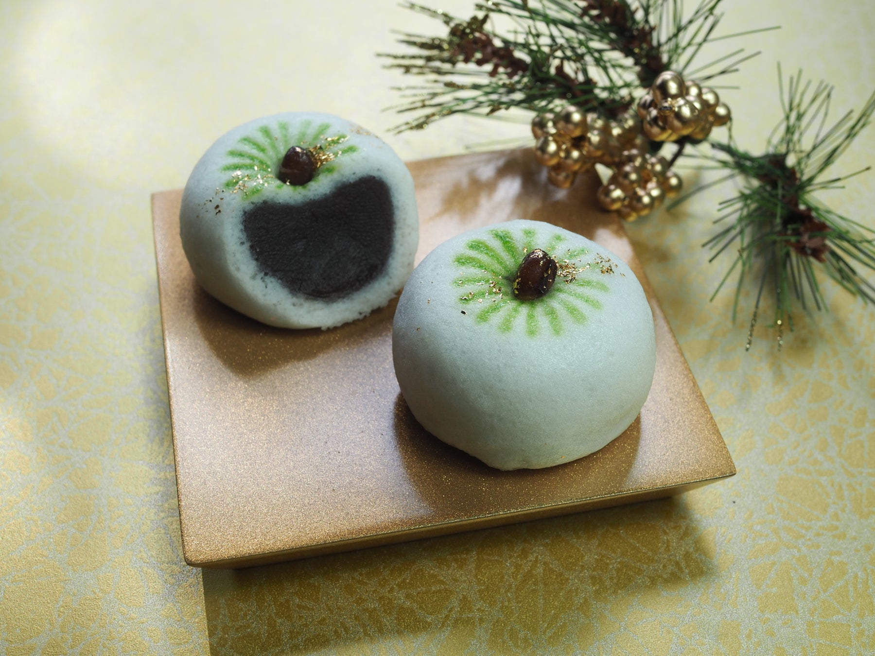 この生地でこしあんを包み、深緑色の生地で松模様に印を押してから、蒸し上げて上用饅頭を作り蜜漬けかのこ豆をのせ、金箔製剤を一つずつ付けて仕上げます。