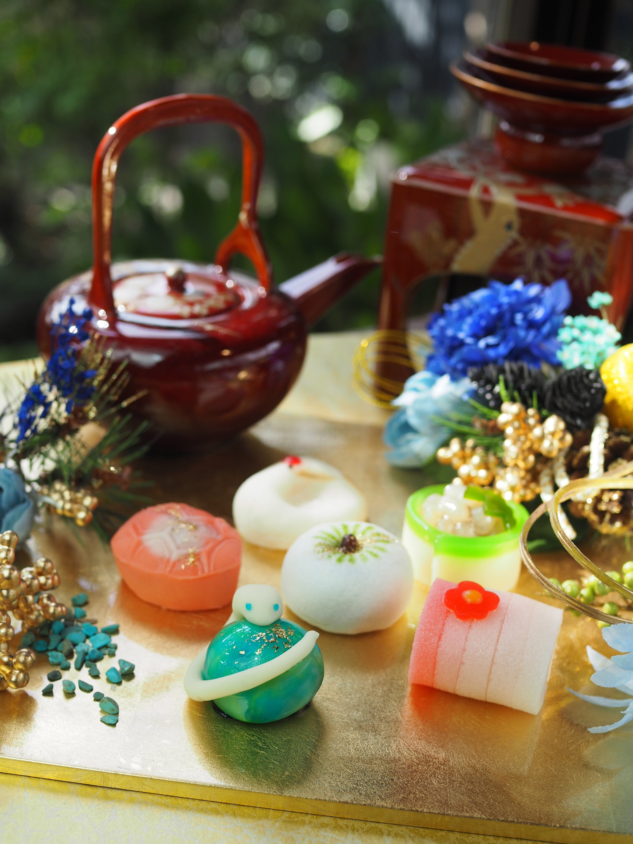 宝玉をイメージしたブルーのマーブル模様の練り切り玉(こし餡)を白蛇で抱え込むように