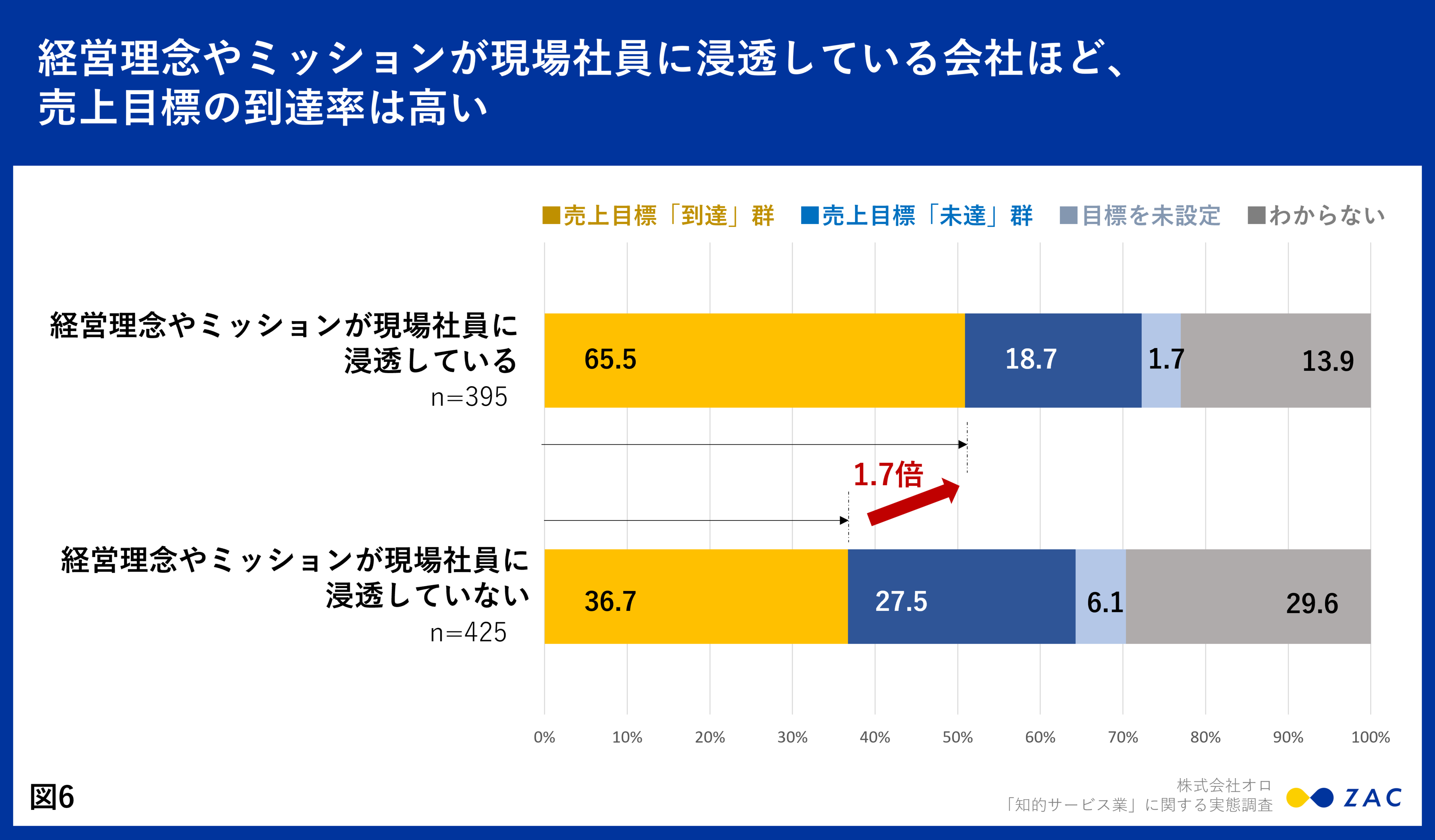 - 経営理念やミッションが現場社員に浸透している会社はそうでない会社に比べ、売上目標の到達率が1.7倍高い傾向