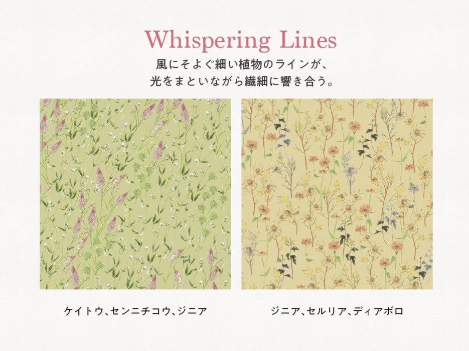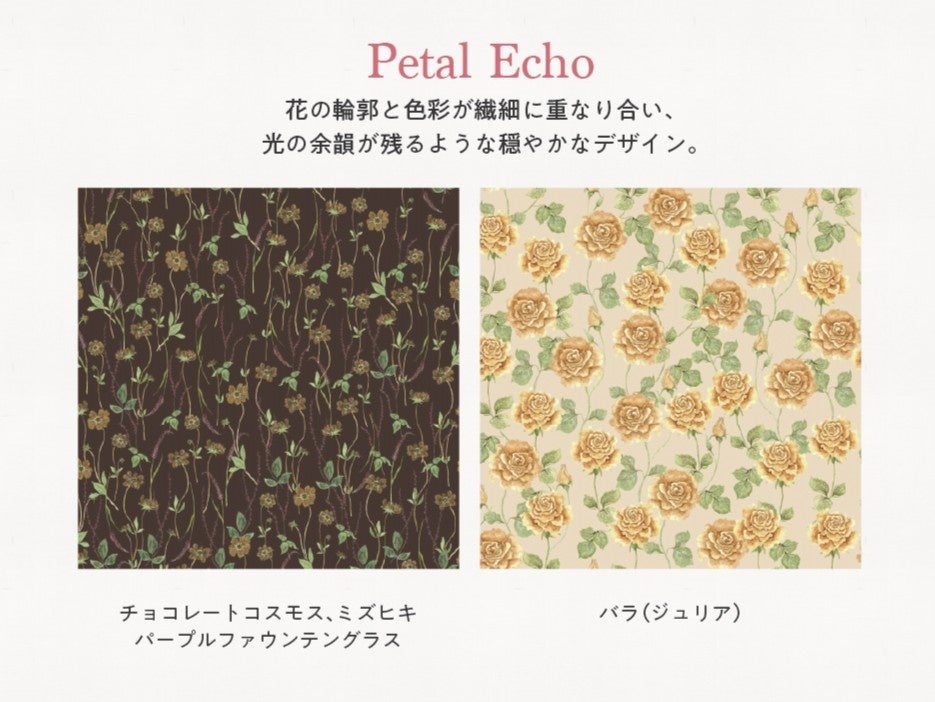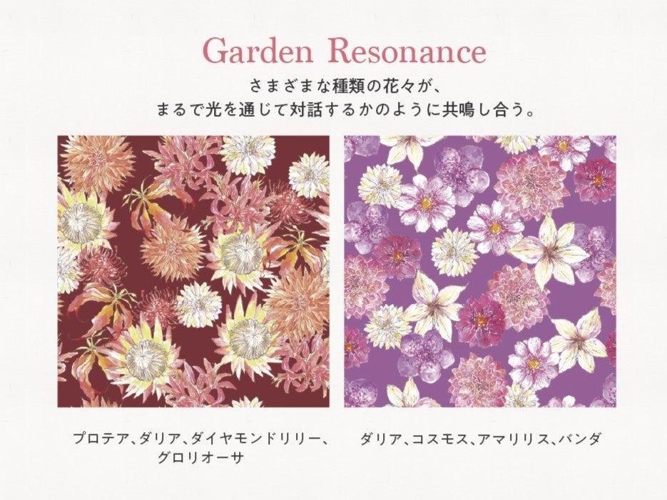 「2026年フラワーパターン」のメインテーマは『Resonance of Light ~光の共鳴~』。陽の光を浴びて輝く花びらの透明感に着目し、光が織りなす繊細な表情や花々が持つ生命力、そして自然の美しさとの調和をデザインに込めました。移りゆく季節の訪れを告げるような秋冬の花々を取り入れた「2026年AW新作フラワーパターン」は、日比谷花壇が誇るデザイナー6名による全6シリーズ、計12パターンをご用意しました。