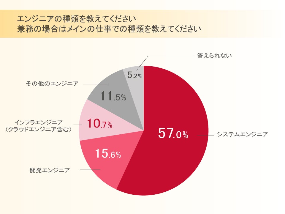 エンジニアの種類をたずねたところ、システムエンジニアが最も多く57%で、次に開発エンジニアが15.6%、インフラエンジニア(クラウドエンジニア含む)が10.7%でした。