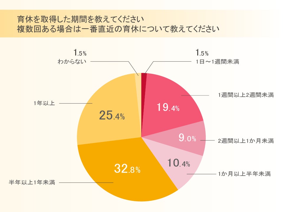 育休を取得した人に期間をたずねたところ、最も多かったのは「半年以上1年未満」で32.8%、次に「1年以上」の25.4%でした。